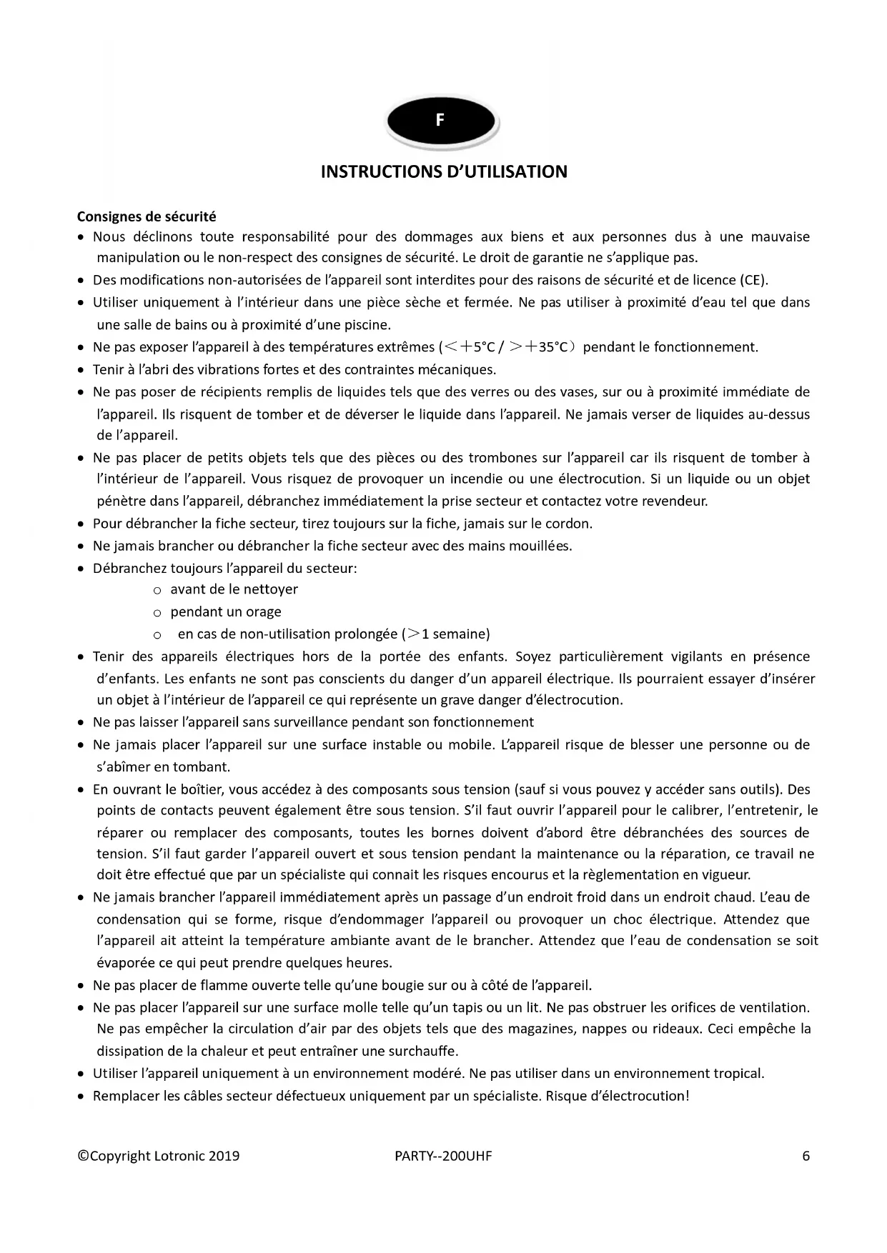 - Remplacer les câbles secteur défectueux uniquement par un spécialiste. Risque d’électrocution! F©Copyright Lotronic 2019 PARTY--200UHF 7