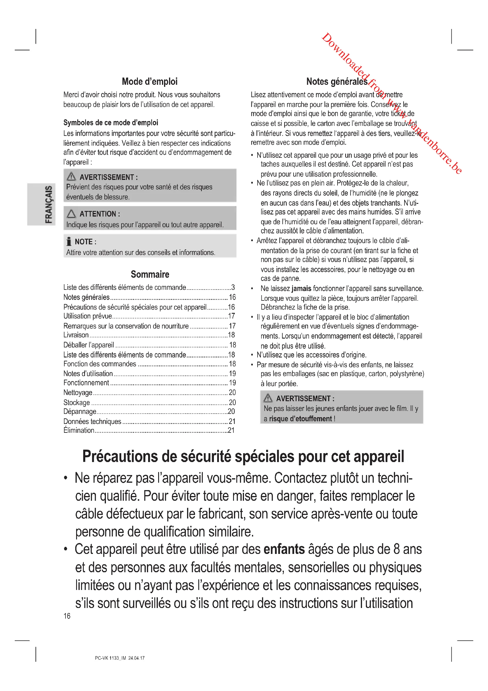- Cet appareil peut être utilisé par des enfants âgés de plus de 8 ans et des personnes aux facultés mentales, sensorielles ou physiques limitées ou n’ayant pas l’expérience et les connaissances requises, s’ils sont surveillés ou s’ils ont reçu des instructions sur l’utilisation Downloaded from www.vandenborre.be17 PC-VK 1133_IM 24.04.17 de l’appareil en toute sécurité et s’ils comprennent les risques en- courus.