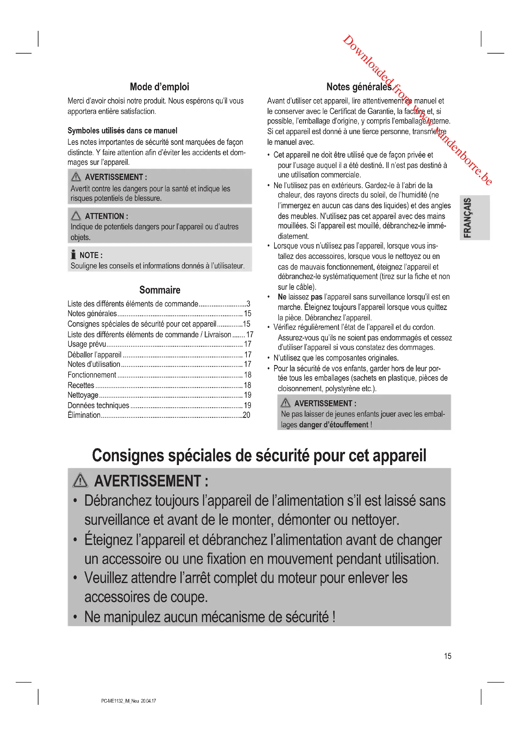 - Consignes spéciales de sécurité pour cet appareil p. 15