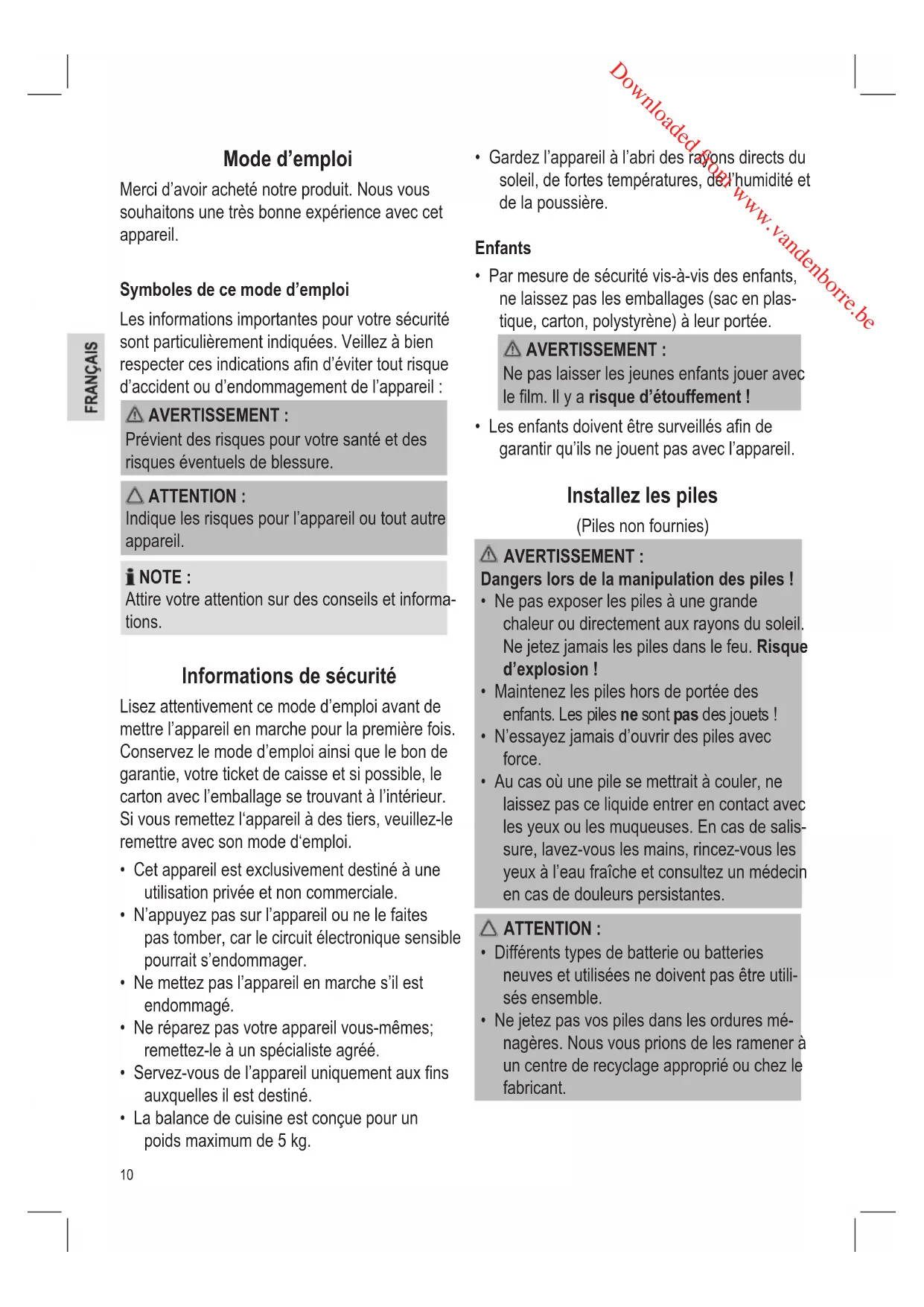 - Ne jetez pas vos piles dans les ordures mé- nagères. Nous vous prions de les ramener à un centre de recyclage approprié ou chez le fabricant. Downloaded from www.vandenborre.be11 NOTE : L’écran afchant “Lo” indique que les piles doivent être remplacées.