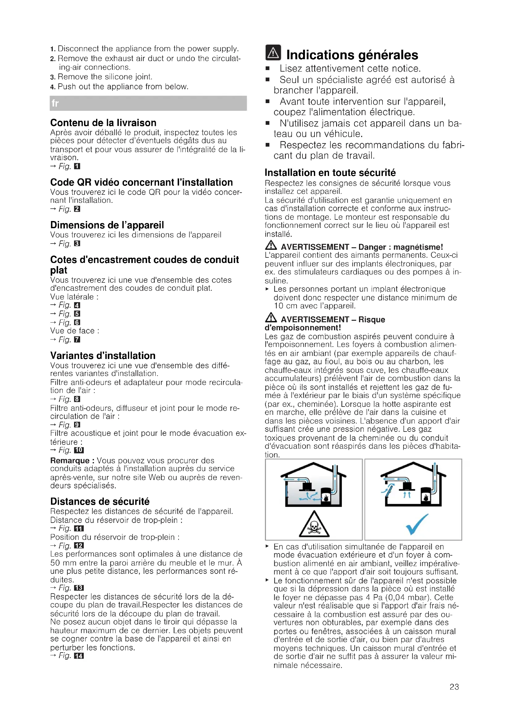 Les personnes portant un implant électronique doivent donc respecter une distance minimum de 10cm avec l’appareil. AVERTISSEMENT‒Risque d'empoisonnement! Les gaz de combustion aspirés peuvent conduire à l'empoisonnement. Les foyers à combustion alimen- tés en air ambiant (par exemple appareils de chauf- fage au gaz, au fioul, au bois ou au charbon, les chauffe-eaux intégrés sous cuve, les chauffe-eaux accumulateurs) prélèvent l'air de combustion dans la pièce où ils sont installés et rejettent les gaz de fu- mée à l'extérieur par le biais d'un système spécifique (par ex., cheminée). Lorsque la hotte aspirante est en marche, elle prélève de l'air dans la cuisine et dans les pièces voisines. L'absence d'un apport d'air suffisant crée une pression négative. Les gaz toxiques provenant de la cheminée ou du conduit d'évacuation sont réaspirés dans les pièces d'habita- tion.