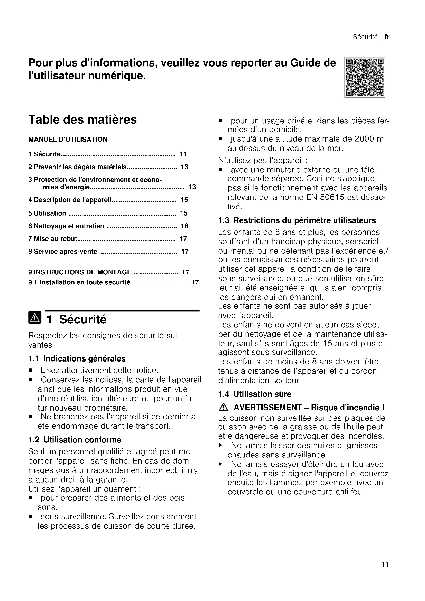 1 Sécurité Respectez les consignes de sécurité sui- vantes. 1.1 Indications générales ¡ Lisez attentivement cette notice. ¡ Conservez les notices, la carte de l'appareil ainsi que les informations produit en vue d’une réutilisation ultérieure ou pour un fu- tur nouveau propriétaire. ¡ Ne branchez pas l’appareil si ce dernier a été endommagé durant le transport. 1.2 Utilisation conforme Seul un personnel qualifié et agréé peut rac- corder l'appareil sans fiche. En cas de dom- mages dus à un raccordement incorrect, il n'y a aucun droit à la garantie. Utilisez l‘appareil uniquement: ¡ pour préparer des aliments et des bois- sons. ¡ sous surveillance. Surveillez constamment les processus de cuisson de courte durée. ¡ pour un usage privé et dans les pièces fer- mées d’un domicile. ¡ jusqu'à une altitude maximale de 2000m au-dessus du niveau de la mer. N’utilisez pas l’appareil: ¡ avec une minuterie externe ou une télé- commande séparée. Ceci ne s'applique pas si le fonctionnement avec les appareils relevant de la norme EN 50615 est désac- tivé. 1.3 Restrictions du périmètre utilisateurs Les enfants de 8 ans et plus, les personnes souffrant d’un handicap physique, sensoriel ou mental ou ne détenant pas l’expérience et/ ou les connaissances nécessaires pourront utiliser cet appareil à condition de le faire sous surveillance, ou que son utilisation sûre leur ait été enseignée et qu’ils aient compris les dangers qui en émanent. Les enfants ne sont pas autorisés à jouer avec l'appareil. Les enfants ne doivent en aucun cas s’occu- per du nettoyage et de la maintenance utilisa- teur, sauf s’ils sont âgés de 15ans et plus et agissent sous surveillance. Les enfants de moins de 8ans doivent être tenus à distance de l’appareil et du cordon d’alimentation secteur. 1.4 Utilisation sûre AVERTISSEMENT‒Risque d'incendie! La cuisson non surveillée sur des plaques de cuisson avec de la graisse ou de l'huile peut être dangereuse et provoquer des incendies. ▶ Ne jamais laisser des huiles et graisses chaudes sans surveillance. ▶ Ne jamais essayer d'éteindre un feu avec de l'eau, mais éteignez l'appareil et couvrez ensuite les flammes, par exemple avec un couvercle ou une couverture anti-feu.fr Sécurité