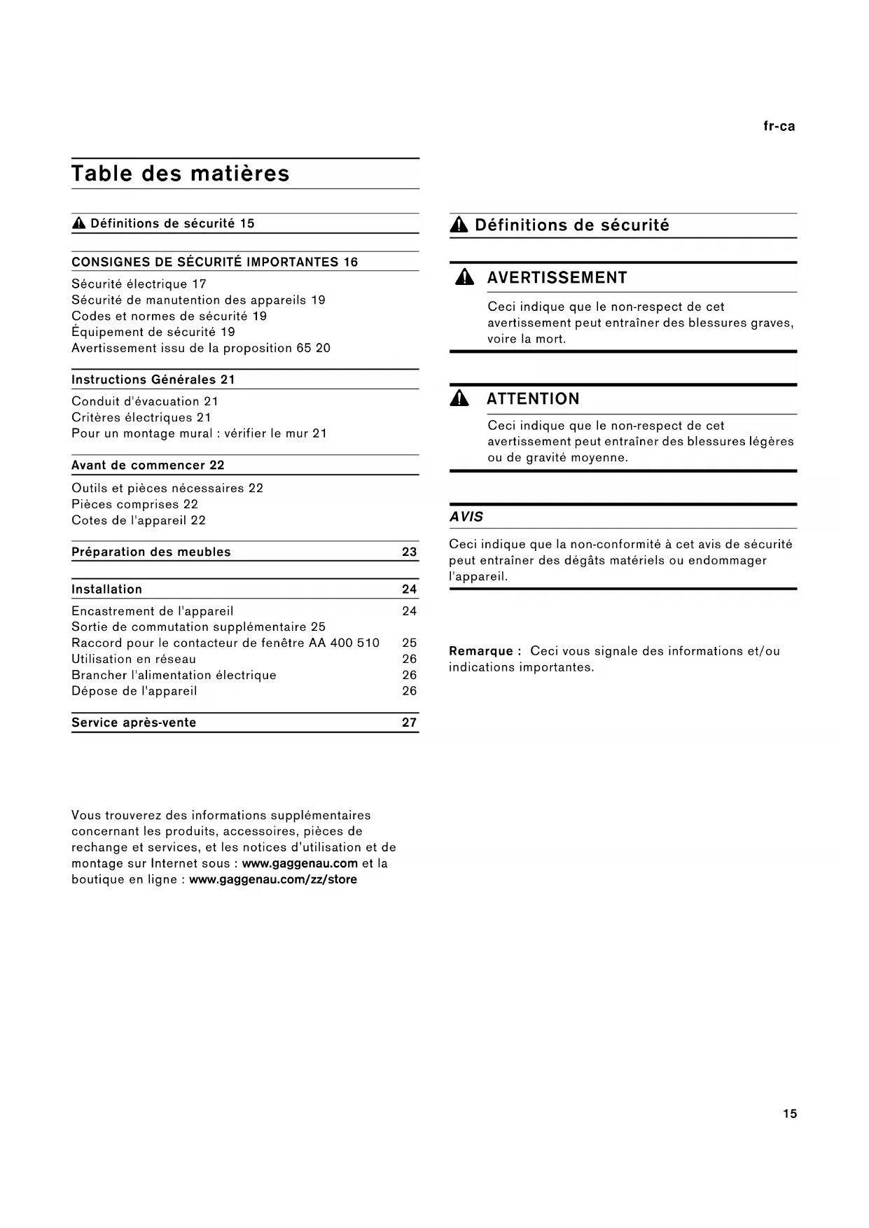 &DQFHUHWGRPPDJHVjODUHSURGXFWLRQ$9(57,66(0(17,668('(/$352326,7,21â'(/e7$7'($9(57,66(0(17/$&$/,)251,(âZZZ3:DUQLQJVFDJRY21 Instructions Générales fr-ca Instructions Générales Instructions Générales Conduit d'évacuation Remarque : Le fabricant de l’appareil décline toute garantie en cas de réclamation imputable à des problèmes liés au parcours des conduits. ▯ L'appareil atteindra un rendement supérieur si le conduit d'évacuation est court et droit et que son diamètre est grand. ▯ Si les conduits d'évacuation sont longs, présentent de nombreux coudes ou ont un diamètre inférieur à 6" (150 mm), la puissance maximale d'aspiration ne sera pas atteinte et le ventilateur fera plus de bruit. ▯ Les tuyaux rigides ou souples constituant le conduit d'évacuation doivent être fabriqués dans un matériau ininflammable. Critères électriques Cet appareil doit être installé et mis à la terre de façon appropriée par un technicien qualifié conformément au Code national de l'électricité ANSI/NFPA 70 (édition la plus récente) et les exigences des codes électriques locaux.AU CANADA : L'installation électrique doit être conforme avec la version la plus récente du Code canadien de l'électricité (première partie) CSA C22.1 et/ ou les codes locaux. L'appareil doit être branché à une fréquence et une tension électrique appropriées, conformément aux renseignements sur la plaque signalétique. Pour un montage mural : vérifier le mur ▯ Le mur doit être plat, vertical et offrir une portance suffisante. ▯ Selon le type de construction (par ex. maçonnerie massive, Rigips, béton cellulaire, les briques Poroton), utiliser des moyens de fixation appropriés. ▯ La profondeur des trous percés doit être adaptée à la longueur des vis. Les chevilles doivent offrir une retenue sûre. ▯ Le moteur séparé pèse au maximum env. 9 kg.22 fr-ca Avant de commencer Avant de commencer Avant de commencer Outils et pièces nécessaires ▯ Tournevis à tête Torx T20▯ Crayon▯ Perceuse avec tête de ¼ po (6 mm)▯ Tournevis à tête Phillips▯ Scie sauteuse▯ Ruban à mesurer▯ Cisailles à métauxRemarque : Des matériaux supplémentaires peuvent être requis pour une installation sur des comptoirs à surfaces solides. Veuillez contacter le fabricant du comptoir. Pièces comprises Cotes de l'appareil