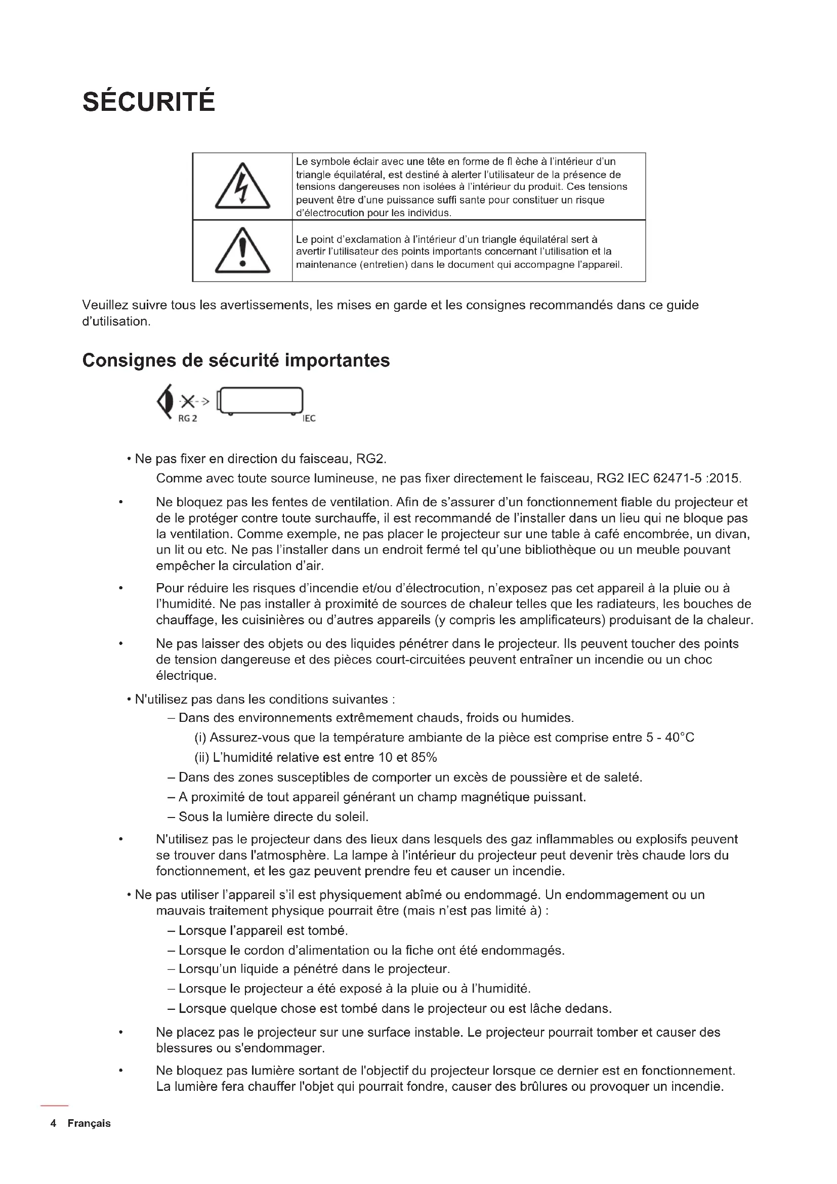 SÉCURITÉ Le symbole éclair avec une tête en forme de èche à l’intérieur d’un triangle équilatéral, est destiné à alerter l’utilisateur de la présence de tensions dangereuses non isolées à l’intérieur du produit. Ces tensions peuvent être d’une puissance suf sante pour constituer un risque d’électrocution pour les individus. Le point d’exclamation à l’intérieur d’un triangle équilatéral sert à avertir l’utilisateur des points importants concernant l’utilisation et la maintenance (entretien) dans le document qui accompagne l’appareil. Veuillez suivre tous les avertissements, les mises en garde et les consignes recommandés dans ce guide d’utilisation. Consignes de sécurité importantes Ne pas xer en direction du faisceau, RG2. Comme avec toute source lumineuse, ne pas xer directement le faisceau, RG2 IEC 62471-5 :2015. Ne bloquez pas les fentes de ventilation. An de s’assurer d’un fonctionnement able du projecteur et de le protéger contre toute surchauffe, il est recommandé de l’installer dans un lieu qui ne bloque pas la ventilation. Comme exemple, ne pas placer le projecteur sur une table à café encombrée, un divan, un lit ou etc. Ne pas l’installer dans un endroit fermé tel qu’une bibliothèque ou un meuble pouvant empêcher la circulation d’air. Pour réduire les risques d’incendie et/ou d’électrocution, n’exposez pas cet appareil à la pluie ou à l’humidité. Ne pas installer à proximité de sources de chaleur telles que les radiateurs, les bouches de chauffage, les cuisinières ou d’autres appareils (y compris les amplicateurs) produisant de la chaleur. Ne pas laisser des objets ou des liquides pénétrer dans le projecteur. Ils peuvent toucher des points de tension dangereuse et des pièces court-circuitées peuvent entraîner un incendie ou un choc électrique. N'utilisez pas dans les conditions suivantes : ± Dans des environnements extrêmement chauds, froids ou humides. (i) Assurez-vous que la température ambiante de la pièce est comprise entre 5 - 40°C (ii) L’humidité relative est entre 10 et 85% ± Dans des zones susceptibles de comporter un excès de poussière et de saleté. ± A proximité de tout appareil générant un champ magnétique puissant. ± Sous la lumière directe du soleil. N'utilisez pas le projecteur dans des lieux dans lesquels des gaz inammables ou explosifs peuvent se trouver dans l'atmosphère. La lampe à l'intérieur du projecteur peut devenir très chaude lors du fonctionnement, et les gaz peuvent prendre feu et causer un incendie. Ne pas utiliser l’appareil s’il est physiquement abîmé ou endommagé. Un endommagement ou un mauvais traitement physique pourrait être (mais n’est pas limité à) : ± Lorsque l’appareil est tombé. ± Lorsque le cordon d’alimentation ou la che ont été endommagés. ± Lorsqu’un liquide a pénétré dans le projecteur. ± Lorsque le projecteur a été exposé à la pluie ou à l’humidité. ± Lorsque quelque chose est tombé dans le projecteur ou est lâche dedans. Ne placez pas le projecteur sur une surface instable. Le projecteur pourrait tomber et causer des blessures ou s'endommager. Ne bloquez pas lumière sortant de l'objectif du projecteur lorsque ce dernier est en fonctionnement. La lumière fera chauffer l'objet qui pourrait fondre, causer des brûlures ou provoquer un incendie.Français 5 Veuillez ne pas ouvrir et ne pas démonter le projecteur car vous pourriez vous électrocuter. Ne pas essayer de réparer le projecteur vous-même. Ouvrir ou retirer les couvercles pourrait vous exposer à des tensions dangereuses ou aux d’autres dangers. Veuillez contacter Optoma avant de faire réparer l’appareil. Référez-vous au boîtier du projecteur pour les marques concernant la sécurité. L’appareil ne peut être réparé que par du personnel de service qualié. Utilisez uniquement les pièces/accessoires spéciés par le constructeur. Ne regardez pas directement l'objectif du projecteur lors de l'utilisation. La force de la lumière risque de vous abîmer les yeux. Lorsque vous changez la lampe, veuillez laisser l’unité refroidir. Suivez les consignes de remplacement à la page 49-50. Ce projecteur détectera automatiquement la durée de vie de la lampe. Veuillez vous assurer de changer la lampe lorsqu’il afche des messages d’avertissement. Réinitialisez la fonction "Mise à zéro lampe" depuis le menu OSD "Réglages > Paramètres Lampe" après avoir remplacé le module de la lampe. Lorsque vous éteignez le projecteur, veuillez vous assurer que le cycle de refroidissement est terminé avant de couper l’alimentation. Laissez le projecteur 90 secondes pour qu’il refroidisse. Lorsque la lampe atteint presque la n de sa durée de vie, le message "Durée de vie de la lampe expirée." s’afchera à l’écran. Veuillez contacter votre revendeur régional ou le centre de service pour remplacer la lampe le plus rapidement possible. Mettez hors tension et débranchez la che d’alimentation de la prise de courant CA avant de nettoyer le produit. Utilisez un chiffon doux et sec avec un détergent doux pour nettoyer le boîtier de l’appareil. N'utilisez pas de nettoyants abrasifs, cires ou solvants pour nettoyer l’appareil. Débranchez le cordon d’alimentation de la prise de courant CA si le produit ne va pas être utilisé pendant une longue période. Remarque : Lorsque la lampe atteint la n de sa vie, le projecteur ne se rallumera pas tant que le module de la lampe n’a pas été remplacé. Pour remplacer la lampe, suivez les procédures qui gurent dans la section “Remplacement de la lampe” en page 49-50. N’installez pas le projecteur à un endroit où il peut être soumis à des vibrations ou des chocs. Ne touchez pas l'objectif à mains nues. Retirez la ou les piles de la télécommande avant stockage. Si la ou les piles restent dans la télécommande pendant de longues périodes, elles peuven