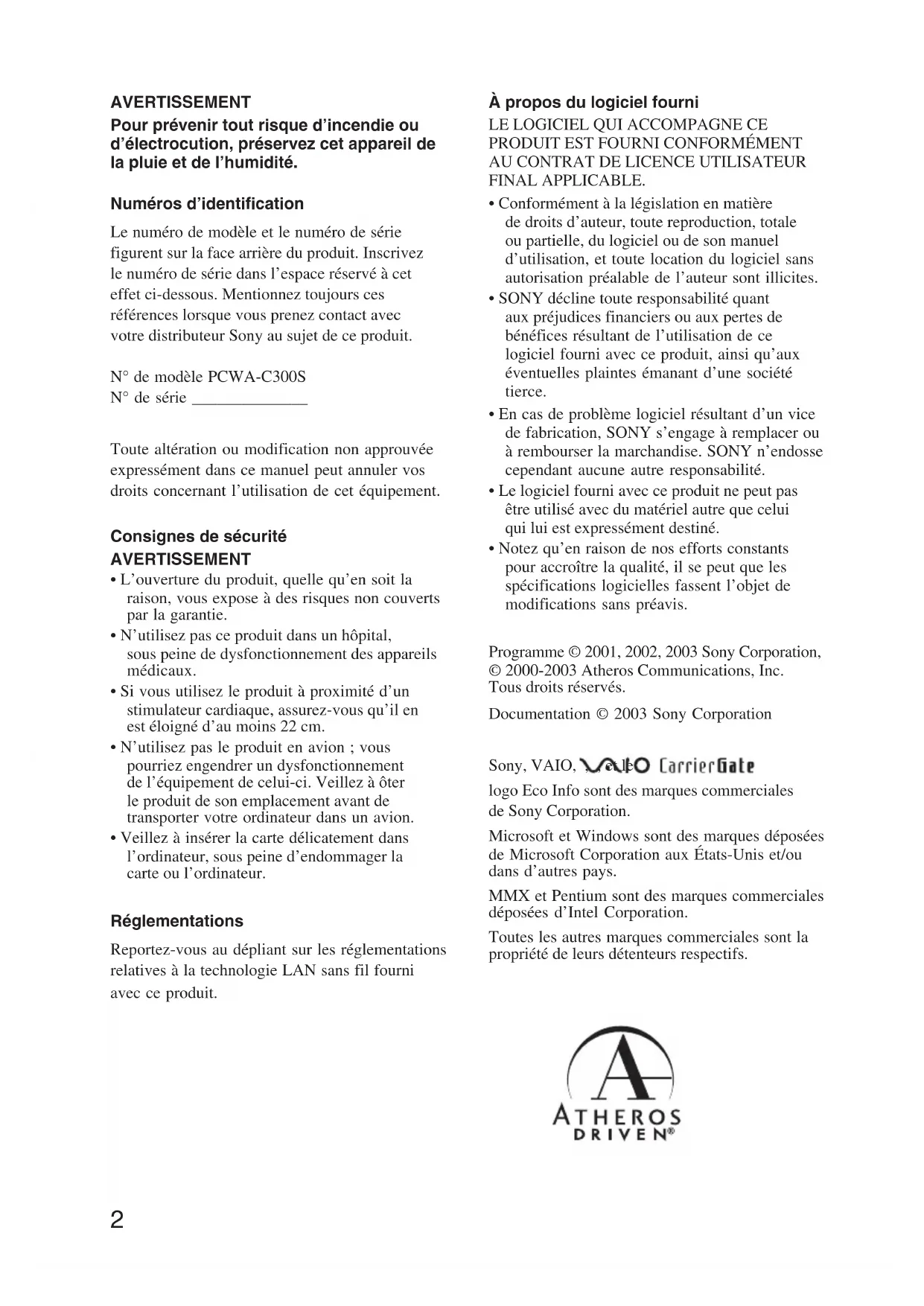 Bei Verwendung einer Wireless LAN PC Card im Netzwerk-Verbindungsmodus Peer-to-Peer müssen Sie die Netzwerkeinstellungen der einzelnen mit dem Netzwerk verbundenen Computer löschen und anschließend die Einstellungen für die drahtlose Datenübertragung neu konfigurieren.Mode d’emploi Wireless LAN PC Card (IEEE 802.11g: 2.4 GHz/54 Mbps) © 2003 Sony Corporation http://www.vaio-link.com http://www.vaio-link.com2 AVERTISSEMENT Pour prévenir tout risque d’incendie ou d’électrocution, préservez cet appareil de la pluie et de l’humidité. Numéros d’identification Le numéro de modèle et le numéro de série figurent sur la face arrière du produit. Inscrivez le numéro de série dans l’espace réservé à cet effet ci-dessous. Mentionnez toujours ces références lorsque vous prenez contact avec votre distributeur Sony au sujet de ce produit. N° de modèle PCWA-C300S N° de série ______________ Toute altération ou modification non approuvée expressément dans ce manuel peut annuler vos droits concernant l’utilisation de cet équipement. Consignes de sécurité AVERTISSEMENT