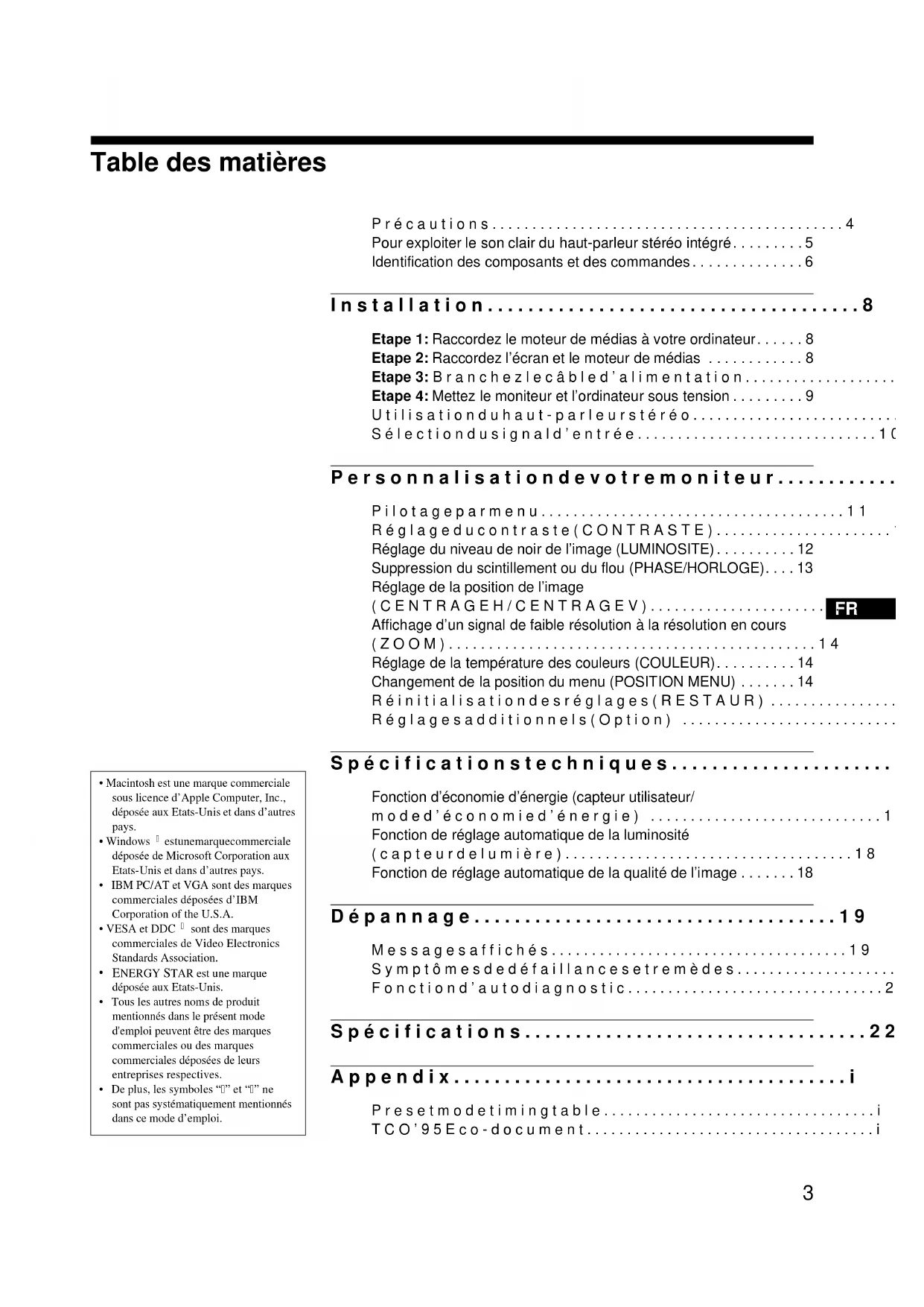 - Spécifications Appendix i Presetmodetimingtable i TCO’95Eco-document i 02FR02BAS-US.book Page 3 Friday, August 17, 2001 10:45 AM4 G:\_Upload\4086226111\4086226111SDMN50RUC\03FR-SDMN50RUC\02FR02BAS-US.fm page maître :Gauche SDM-N50R 4-086-226-11 (1) Précautions Avertissement sur les connexions d’alimentation p. 22