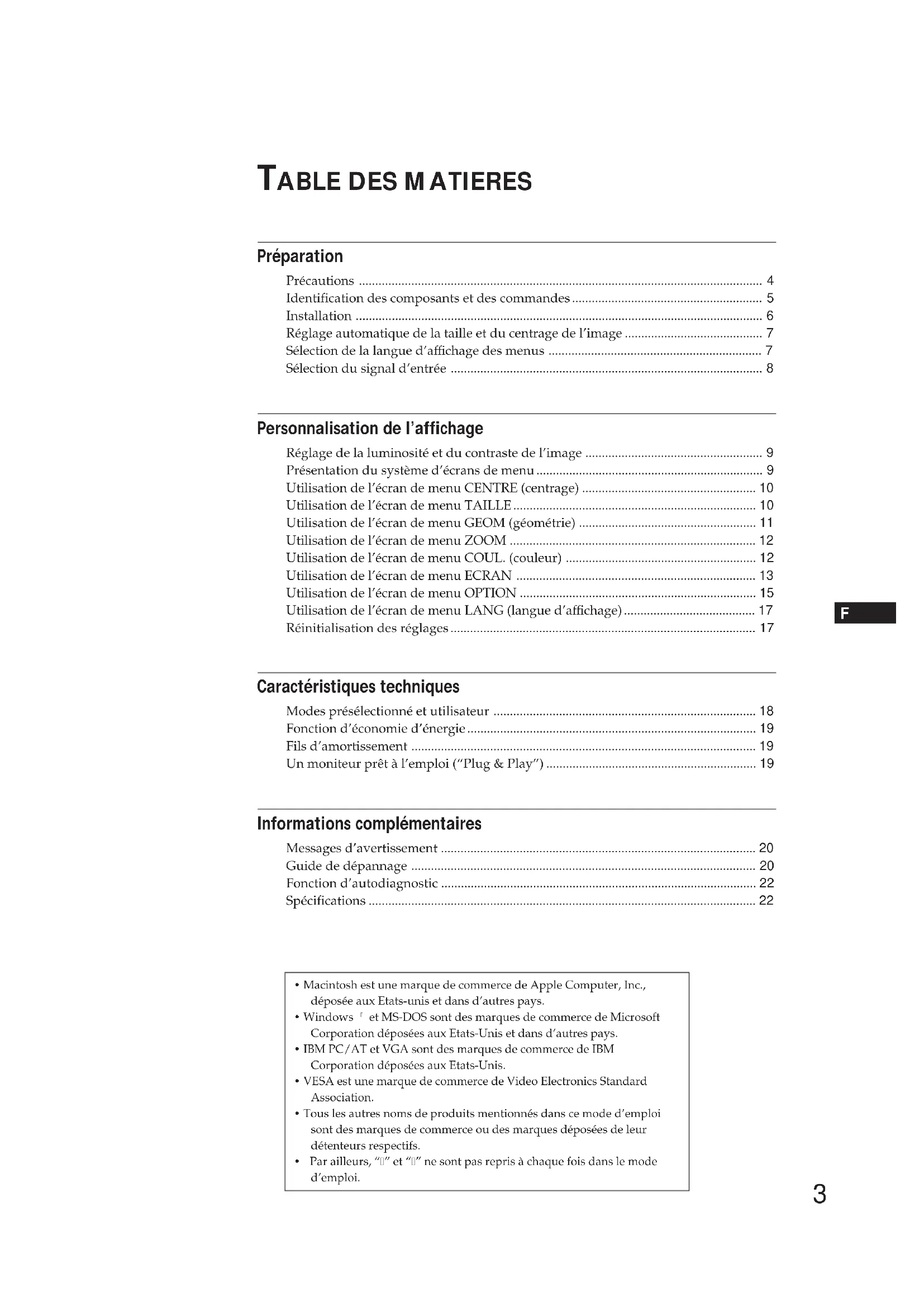 - Macintosh est une marque de commerce de Apple Computer, Inc.,déposée aux Etats-unis et dans d’autres pays.• Windows et MS-DOS sont des marques de commerce de MicrosoftCorporation déposées aux Etats-Unis et dans d’autres pays.• IBM PC/AT et VGA sont des marques de commerce de IBMCorporation déposées aux Etats-Unis.• VESA est une marque de commerce de Video Electronics StandardAssociation.• Tous les autres noms de produits mentionnés dans ce mode d’emploisont des marques de commerce ou des marques déposées de leurdétenteurs respectifs.