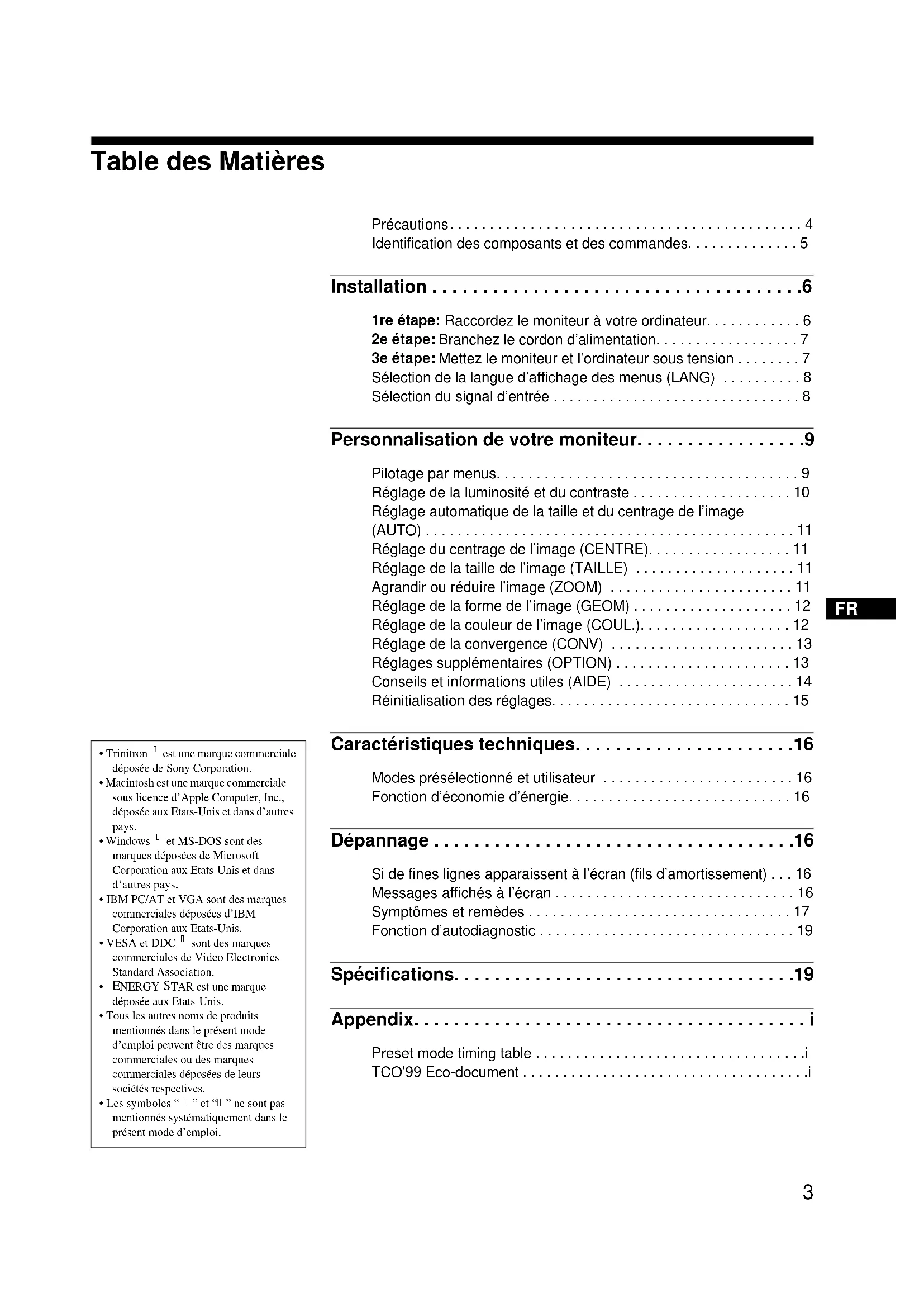 Précautions. . . . . . . . . . . . . . . . . . . . . . . . . . . . . . . . . . . . . . . . . . . . 4 Identification des composants et des commandes. . . . . . . . . . . . . . 5 Installation . . . . . . . . . . . . . . . . . . . . . . . . . . . . . . . . . . . . .6 1re étape: Raccordez le moniteur à votre ordinateur. . . . . . . . . . . . 6 2e étape: Branchez le cordon d’alimentation. . . . . . . . . . . . . . . . . . 7 3e étape: Mettez le moniteur et l’ordinateur sous tension . . . . . . . . 7 Sélection de la langue d’affichage des menus (LANG) . . . . . . . . . . 8 Sélection du signal d’entrée . . . . . . . . . . . . . . . . . . . . . . . . . . . . . . . 8 Personnalisation de votre moniteur. . . . . . . . . . . . . . . . .9 Pilotage par menus. . . . . . . . . . . . . . . . . . . . . . . . . . . . . . . . . . . . . . 9 Réglage de la luminosité et du contraste . . . . . . . . . . . . . . . . . . . . 10 Réglage automatique de la taille et du centrage de l’image (AUTO) . . . . . . . . . . . . . . . . . . . . . . . . . . . . . . . . . . . . . . . . . . . . . . 11 Réglage du centrage de l’image (CENTRE). . . . . . . . . . . . . . . . . . 11 Réglage de la taille de l’image (TAILLE) . . . . . . . . . . . . . . . . . . . . 11 Agrandir ou réduire l’image (ZOOM) . . . . . . . . . . . . . . . . . . . . . . . 11 Réglage de la forme de l’image (GEOM) . . . . . . . . . . . . . . . . . . . . 12 Réglage de la couleur de l’image (COUL.). . . . . . . . . . . . . . . . . . . 12 Réglage de la convergence (CONV) . . . . . . . . . . . . . . . . . . . . . . . 13 Réglages supplémentaires (OPTION) . . . . . . . . . . . . . . . . . . . . . . 13 Conseils et informations utiles (AIDE) . . . . . . . . . . . . . . . . . . . . . . 14 Réinitialisation des réglages. . . . . . . . . . . . . . . . . . . . . . . . . . . . . . 15 Caractéristiques techniques. . . . . . . . . . . . . . . . . . . . . .16 Modes présélectionné et utilisateur . . . . . . . . . . . . . . . . . . . . . . . . 16 Fonction d’économie d’énergie. . . . . . . . . . . . . . . . . . . . . . . . . . . . 16 Dépannage . . . . . . . . . . . . . . . . . . . . . . . . . . . . . . . . . . . .16 Si de fines lignes apparaissent à l’écran (fils d’amortissement) . . . 16 Messages affichés à l’écran . . . . . . . . . . . . . . . . . . . . . . . . . . . . . . 16 Symptômes et remèdes . . . . . . . . . . . . . . . . . . . . . . . . . . . . . . . . . 17 Fonction d’autodiagnostic . . . . . . . . . . . . . . . . . . . . . . . . . . . . . . . . 19 Spécifications. . . . . . . . . . . . . . . . . . . . . . . . . . . . . . . . . .19 Appendix. . . . . . . . . . . . . . . . . . . . . . . . . . . . . . . . . . . . . . . i Preset mode timing table . . . . . . . . . . . . . . . . . . . . . . . . . . . . . . . . . .i TCO’99 Eco-document . . . . . . . . . . . . . . . . . . . . . . . . . . . . . . . . . . . .i4 D:\###sagyou\08 gatu\0827-y\386760621CPD-G400\02FR02BAS-UC.fm masterpage:Left CPD-G400 3-867-606-21 (1) Précautions Avertissement sur le raccordement à la source d’alimentation