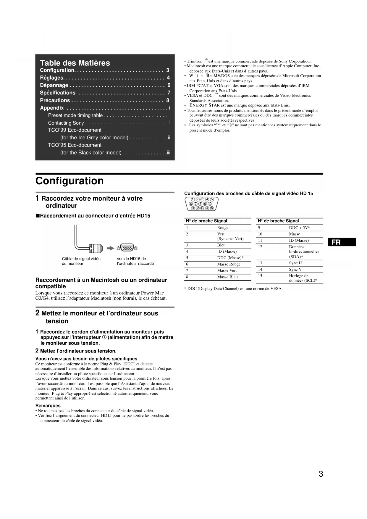 - Les symboles “” et “” ne sont pas mentionnés systématiquement dans le présent mode d’emploi. Configuration 1 Raccordez votre moniteur à votre ordinateur x Raccordement au connecteur d’entrée HD15 Raccordement à un Macintosh ou un ordinateur compatible Lorsque vous raccordez ce moniteur à un ordinateur Power Mac G3/G4, utilisez l’adaptateur Macintosh (non fourni), le cas échéant. 2 Mettez le moniteur et l’ordinateur sous tension 1 Raccordez le cordon d’alimentation au moniteur puis appuyez sur l’interrupteur ! (alimentation) afin de mettre le moniteur sous tension. 2 Mettez l’ordinateur sous tension. Vous n’avez pas besoin de pilotes spécifiquesCe moniteur est conforme à la norme Plug & Play “DDC” et détecte automatiquement l’ensemble des informations relatives au moniteur. Il n’est pas nécessaire d’installer un pilote spécifique sur l’ordinateur.Lorsque vous mettez votre ordinateur sous tension pour la première fois, après l’avoir raccordé au moniteur, il est possible que l’Assistant d’ajout de nouveau matériel apparaisse à l’écran. Dans ce cas, suivez les instructions affichées. Le moniteur Plug & Play approprié est sélectionné automatiquement, vous permettant ainsi de l’utiliser.Remarques• Ne touchez pas les broches du connecteur du câble de signal vidéo.• Vérifiez l’alignement du connecteur HD15 pour ne pas tordre les broches du connecteur du câble de signal vidéo.Configuration des broches du câble de signal vidéo HD 15* DDC (Display Data Channel) est une norme de VESA. Table des Matières Configuration. . . . . . . . . . . . . . . . . . . . . . . . . . . . . . . 3Réglages. . . . . . . . . . . . . . . . . . . . . . . . . . . . . . . . . . . 4Dépannage . . . . . . . . . . . . . . . . . . . . . . . . . . . . . . . . . 6Spécifications . . . . . . . . . . . . . . . . . . . . . . . . . . . . . . 7Précautions . . . . . . . . . . . . . . . . . . . . . . . . . . . . . . . . 8Appendix . . . . . . . . . . . . . . . . . . . . . . . . . . . . . . . . . . . iPreset mode timing table . . . . . . . . . . . . . . . . . . . . . . . iContacting Sony . . . . . . . . . . . . . . . . . . . . . . . . . . . . iTCO’99 Eco-document (for the Ice Grey color model) . . . . . . . . . . . . . iiTCO’95 Eco-document (for the Black color model) . . . . . . . . . . . . . . .iii Câble de signal vidéo du moniteur vers le HD15 de l’ordinateur raccordé