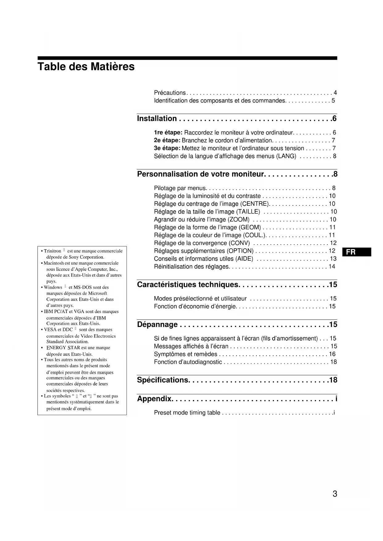 Précautions. . . . . . . . . . . . . . . . . . . . . . . . . . . . . . . . . . . . . . . . . . . . 4 Identification des composants et des commandes. . . . . . . . . . . . . . 5 Installation . . . . . . . . . . . . . . . . . . . . . . . . . . . . . . . . . . . . .6 1re étape: Raccordez le moniteur à votre ordinateur. . . . . . . . . . . . 6 2e étape: Branchez le cordon d’alimentation. . . . . . . . . . . . . . . . . . 7 3e étape: Mettez le moniteur et l’ordinateur sous tension . . . . . . . . 7 Sélection de la langue d’affichage des menus (LANG) . . . . . . . . . . 8 Personnalisation de votre moniteur. . . . . . . . . . . . . . . . .8 Pilotage par menus. . . . . . . . . . . . . . . . . . . . . . . . . . . . . . . . . . . . . . 8 Réglage de la luminosité et du contraste . . . . . . . . . . . . . . . . . . . . 10 Réglage du centrage de l’image (CENTRE). . . . . . . . . . . . . . . . . . 10 Réglage de la taille de l’image (TAILLE) . . . . . . . . . . . . . . . . . . . . 10 Agrandir ou réduire l’image (ZOOM) . . . . . . . . . . . . . . . . . . . . . . . 10 Réglage de la forme de l’image (GEOM) . . . . . . . . . . . . . . . . . . . . 11 Réglage de la couleur de l’image (COUL.). . . . . . . . . . . . . . . . . . . 11 Réglage de la convergence (CONV) . . . . . . . . . . . . . . . . . . . . . . . 12 Réglages supplémentaires (OPTION) . . . . . . . . . . . . . . . . . . . . . . 12 Conseils et informations utiles (AIDE) . . . . . . . . . . . . . . . . . . . . . . 13 Réinitialisation des réglages. . . . . . . . . . . . . . . . . . . . . . . . . . . . . . 14 Caractéristiques techniques. . . . . . . . . . . . . . . . . . . . . .15 Modes présélectionné et utilisateur . . . . . . . . . . . . . . . . . . . . . . . . 15 Fonction d’économie d’énergie. . . . . . . . . . . . . . . . . . . . . . . . . . . . 15 Dépannage . . . . . . . . . . . . . . . . . . . . . . . . . . . . . . . . . . . .15 Si de fines lignes apparaissent à l’écran (fils d’amortissement) . . . 15 Messages affichés à l’écran . . . . . . . . . . . . . . . . . . . . . . . . . . . . . . 15 Symptômes et remèdes . . . . . . . . . . . . . . . . . . . . . . . . . . . . . . . . . 16 Fonction d’autodiagnostic . . . . . . . . . . . . . . . . . . . . . . . . . . . . . . . . 18 Spécifications. . . . . . . . . . . . . . . . . . . . . . . . . . . . . . . . . .18 Appendix. . . . . . . . . . . . . . . . . . . . . . . . . . . . . . . . . . . . . . . i Preset mode timing table . . . . . . . . . . . . . . . . . . . . . . . . . . . . . . . . . .i 01US01COV-UC.book Page 3 Friday, October 22, 1999 10:19 AM4 D:\###sagyou\10 gatu\1022\407410412CPDE400_UC\02FR02BAS-UC.fm masterpage:Left CPD-E400 4-074-104-12 (1) Précautions Avertissement sur le raccordement à la source d’alimentation