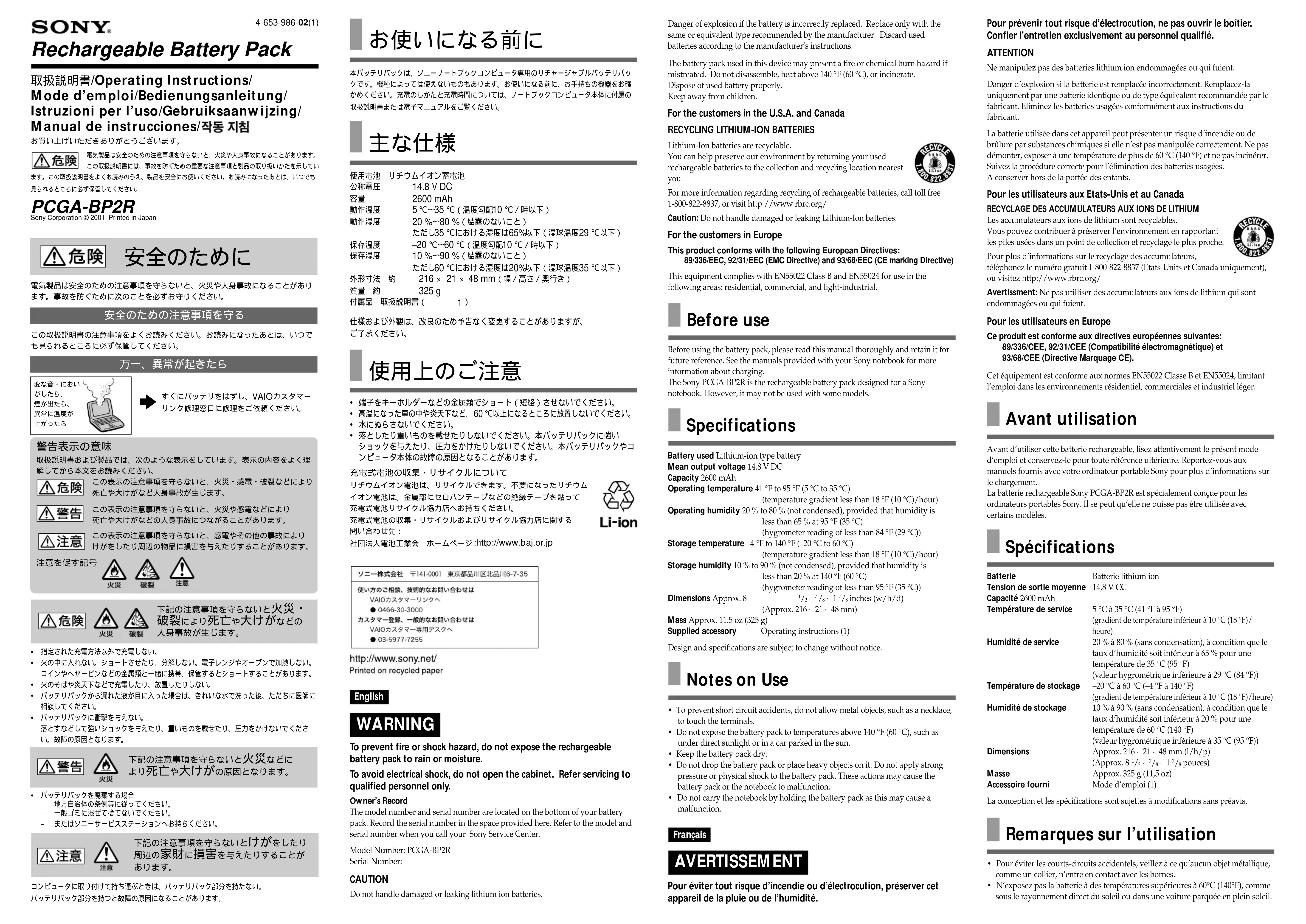 - To prevent short circuit accidents, do not allow metal objects, such as a necklace,to touch the terminals.• Do not expose the battery pack to temperatures above 140 °F (60 °C), such asunder direct sunlight or in a car parked in the sun.• Keep the battery pack dry.• Do not drop the battery pack or place heavy objects on it. Do not apply strongpressure or physical shock to the battery pack. These actions may cause thebattery pack or the notebook to malfunction.• Do not carry the notebook by holding the battery pack as this may cause amalfunction. Pour prévenir tout risque d’électrocution, ne pas ouvrir le boîtier. Confier l’entretien exclusivement au personnel qualifié. ATTENTION Ne manipulez pas des batteries lithium ion endommagées ou qui fuient.Danger d’explosion si la batterie est remplacée incorrectement. Remplacez-launiquement par une batterie identique ou de type équivalent recommandée par lefabricant. Eliminez les batteries usagées conformément aux instructions dufabricant.La batterie utilisée dans cet appareil peut présenter un risque d’incendie ou debrûlure par substances chimiques si elle n’est pas manipulée correctement. Ne pasdémonter, exposer à une température de plus de 60 °C (140 °F) et ne pas incinérer.Suivez la procédure correcte pour l’élimination des batteries usagées.A conserver hors de la portée des enfants. Pour les utilisateurs aux Etats-Unis et au Canada RECYCLAGE DES ACCUMULATEURS AUX IONS DE LITHIUMLes accumulateurs aux ions de lithium sont recyclables.Vous pouvez contribuer à préserver l’environnement en rapportantles piles usées dans un point de collection et recyclage le plus proche.Pour plus d’informations sur le recyclage des accumulateurs,téléphonez le numéro gratuit 1-800-822-8837 (Etats-Units et Canada uniquement),ou visitez http://www.rbrc.org/Avertissment: Ne pas utilliser des accumulateurs aux ions de lithium qui sontendommagées ou qui fuient. Pour les utilisateurs en Europe Ce produit est conforme aux directives européennes suivantes:89/336/CEE, 92/31/CEE (Compatibilité électromagnétique) et93/68/CEE (Directive Marquage CE).Cet équipement est conforme aux normes EN55022 Classe B et EN55024, limitantl’emploi dans les environnements résidentiel, commerciales et industriel léger. Avant utilisation Avant d’utiliser cette batterie rechargeable, lisez attentivement le présent moded’emploi et conservez-le pour toute référence ultérieure. Reportez-vous auxmanuels fournis avec votre ordinateur portable Sony pour plus d’informations surle chargement.La batterie rechargeable Sony PCGA-BP2R est spécialement conçue pour lesordinateurs portables Sony. Il se peut qu’elle ne puisse pas être utilisée aveccertains modèles. Spécifications Batterie Batterie lithium ionTension de sortie moyenne 14,8 V CCCapacité 2600 mAhTempérature de service 5 °C à 35 °C (41 °F à 95 °F)(gradient de température inférieur à 10 °C (18 °F)/heure) Humidité de service 20 % à 80 % (sans condensation), à condition que le taux d’humidité soit inférieur à 65 % pour unetempérature de 35 °C (95 °F)(valeur hygrométrique inférieure à 29 °C (84 °F))Température de stockage –20 °C à 60 °C (–4 °F à 140 °F)(gradient de température inférieur à 10 °C (18 °F)/heure) Humidité de stockage 10 % à 90 % (sans condensation), à condition que le taux d’humidité soit inférieur à 20 % pour unetempérature de 60 °C (140 °F)(valeur hygrométrique inférieure à 35 °C (95 °F)) Dimensions Approx. 216 × 21 × 48 mm (l/h/p) (Approx. 8