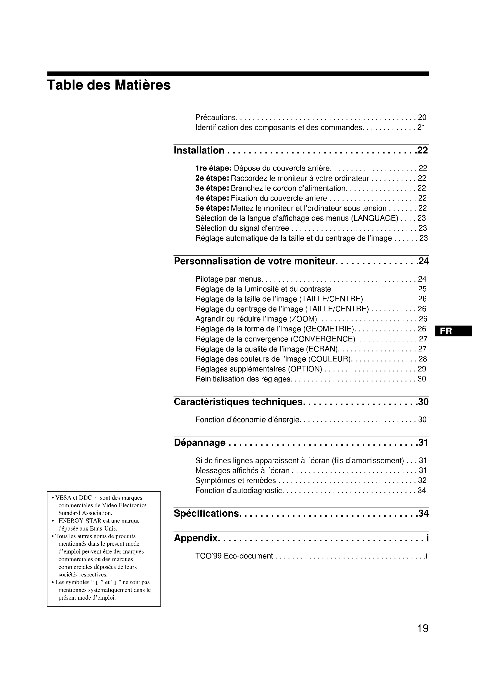 Précautions. . . . . . . . . . . . . . . . . . . . . . . . . . . . . . . . . . . . . . . . . . . 20 Identification des composants et des commandes. . . . . . . . . . . . . 21 Installation . . . . . . . . . . . . . . . . . . . . . . . . . . . . . . . . . . . .22 1re étape: Dépose du couvercle arrière. . . . . . . . . . . . . . . . . . . . . 22 2e étape: Raccordez le moniteur à votre ordinateur . . . . . . . . . . . 22 3e étape: Branchez le cordon d’alimentation. . . . . . . . . . . . . . . . . 22 4e étape: Fixation du couvercle arrière . . . . . . . . . . . . . . . . . . . . . 22 5e étape: Mettez le moniteur et l’ordinateur sous tension . . . . . . . 22 Sélection de la langue d’affichage des menus (LANGUAGE) . . . . 23 Sélection du signal d’entrée . . . . . . . . . . . . . . . . . . . . . . . . . . . . . . 23 Réglage automatique de la taille et du centrage de l’image . . . . . . 23 Personnalisation de votre moniteur. . . . . . . . . . . . . . . .24 Pilotage par menus. . . . . . . . . . . . . . . . . . . . . . . . . . . . . . . . . . . . . 24 Réglage de la luminosité et du contraste . . . . . . . . . . . . . . . . . . . . 25 Réglage de la taille de l’image (TAILLE/CENTRE). . . . . . . . . . . . . 26 Réglage du centrage de l’image (TAILLE/CENTRE) . . . . . . . . . . . 26 Agrandir ou réduire l’image (ZOOM) . . . . . . . . . . . . . . . . . . . . . . . 26 Réglage de la forme de l’image (GEOMETRIE). . . . . . . . . . . . . . . 26 Réglage de la convergence (CONVERGENCE) . . . . . . . . . . . . . . 27 Réglage de la qualité de l’image (ECRAN). . . . . . . . . . . . . . . . . . . 27 Réglage des couleurs de l’image (COULEUR). . . . . . . . . . . . . . . . 28 Réglages supplémentaires (OPTION) . . . . . . . . . . . . . . . . . . . . . . 29 Réinitialisation des réglages. . . . . . . . . . . . . . . . . . . . . . . . . . . . . . 30 Caractéristiques techniques. . . . . . . . . . . . . . . . . . . . . .30 Fonction d’économie d’énergie. . . . . . . . . . . . . . . . . . . . . . . . . . . . 30 Dépannage . . . . . . . . . . . . . . . . . . . . . . . . . . . . . . . . . . . .31 Si de fines lignes apparaissent à l’écran (fils d’amortissement) . . . 31 Messages affichés à l’écran . . . . . . . . . . . . . . . . . . . . . . . . . . . . . . 31 Symptômes et remèdes . . . . . . . . . . . . . . . . . . . . . . . . . . . . . . . . . 32 Fonction d’autodiagnostic. . . . . . . . . . . . . . . . . . . . . . . . . . . . . . . . 34 Spécifications. . . . . . . . . . . . . . . . . . . . . . . . . . . . . . . . . .34 Appendix. . . . . . . . . . . . . . . . . . . . . . . . . . . . . . . . . . . . . . . i TCO’99 Eco-document . . . . . . . . . . . . . . . . . . . . . . . . . . . . . . . . . . . .i20 Précautions Avertissement sur le raccordement à la source d’alimentation Utilisez un cordon d’alimentation approprié en fonction de la tension d’alimentation secteur locale.