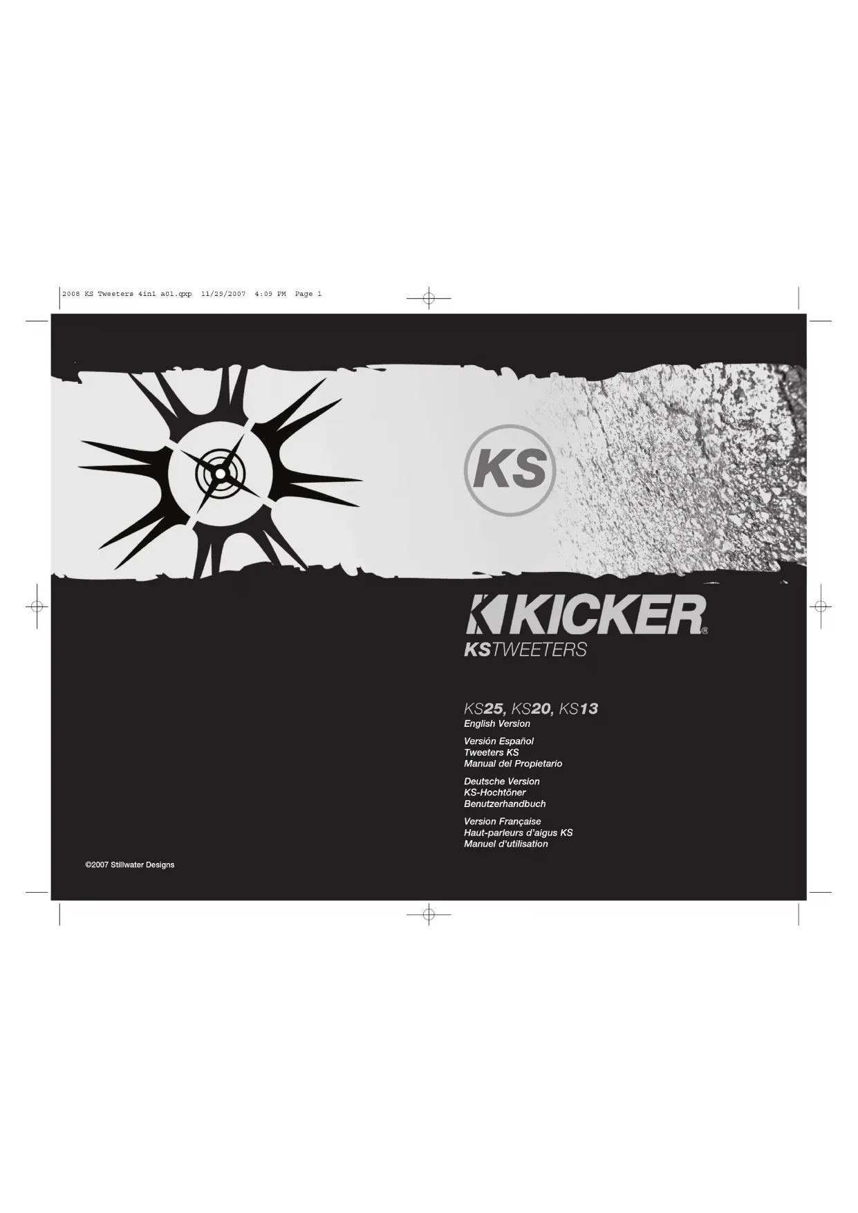 l'ouïe de façon irréversible ! L'augmentation du volume d'un système jusqu'à un niveau présentant une distorsion audible endommage davantage l'ouïe que l'écoute d'un système sans distorsion au même volume. Le seuil de la douleur est toujours le signe que le niveau sonore est trop élevé et risque d'endommager l'ouïe de façon irréversible. Réglez le volume en faisant prevue de bon sens ! L'expression " carburant pour vivre plein pot " fait référence au dynamisme de la marque Kicker d'équipements audio pour véhicules et a pour but d'encourager nos clients à faire le maximum (" vivre plein pot ") dans tous les aspects de leur vie. Les haut-parleurs et amplificateurs Kicker sont les meilleurs dans le domaine des équipements audio et représentent donc pour nos client le " carburant pour vivre plein pot " dans l'aspect " installation audio de véhicule " de leur vie. Nous encourageons tous nos clients à respecter toutes les lois et réglementations locales relatives aux niveaux sonores acceptables à l'extérieur des véhicules. GARANTIE WARRANTY 2008 KS Tweeters 4in1 a01.qxp 11/29/2007 4:09 PM Page 10