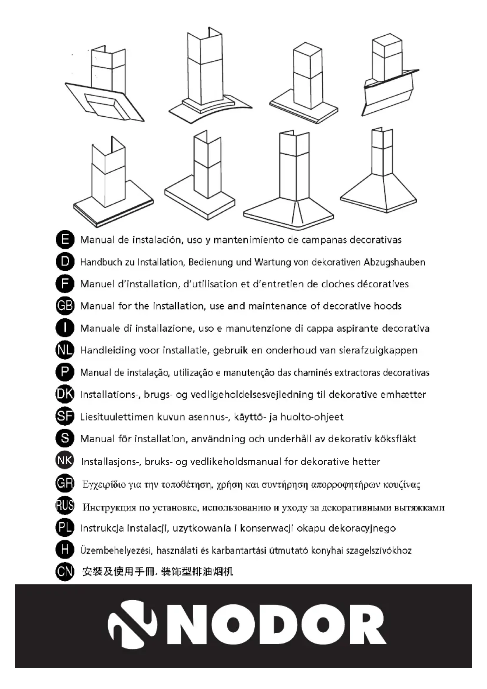 Lorsque vous remplacez les lampes halogènes, celles-ci doi- vent être remplacées par des lampes à réflecteur en aluminium. Ne jamais utiliser des lampes dichroïques, afin d'éviter une surchauffe du support de la lampe. LE FABRICANT DÉCLINE TOUTE RESPONSABILITÉ DANS LE CAS OÙ NE SERAIENT PAS OBSERVÉES LES INDICATIONS DÉCRITES CONCERNANT L'INSTALLATION, L'ENTRETIEN ET L'UTILISATION APPROPRIÉS DE LA HOTTE D'EXTRACTION Le fabricant déclare que ce produit remplit toutes les conditions essentielles requises par la directive 2006/95/CEE du 12 déc- embre 2006 sur matériel électrique de basse tension, et par la directive 2004/108/CEE du 15 décembre 2004 sur compatibilité électromagnétique. Si vous avez besoin d'une assistance technique ou d'un complément d'information sur nos produits, n'hésitez pas à contacter notre distributeur officiel. LE FABRICANT se réserve le droit d'effectuer toute amélioration technologique ou modification sans préavis.DECORATIVE EXTRACTOR HOODS Dear client, We are sure that the purchase of our extractor hood will fully satisfy all of your needs. Please read this instruction manual carefully in order to obtain the best results from the use of the hood.