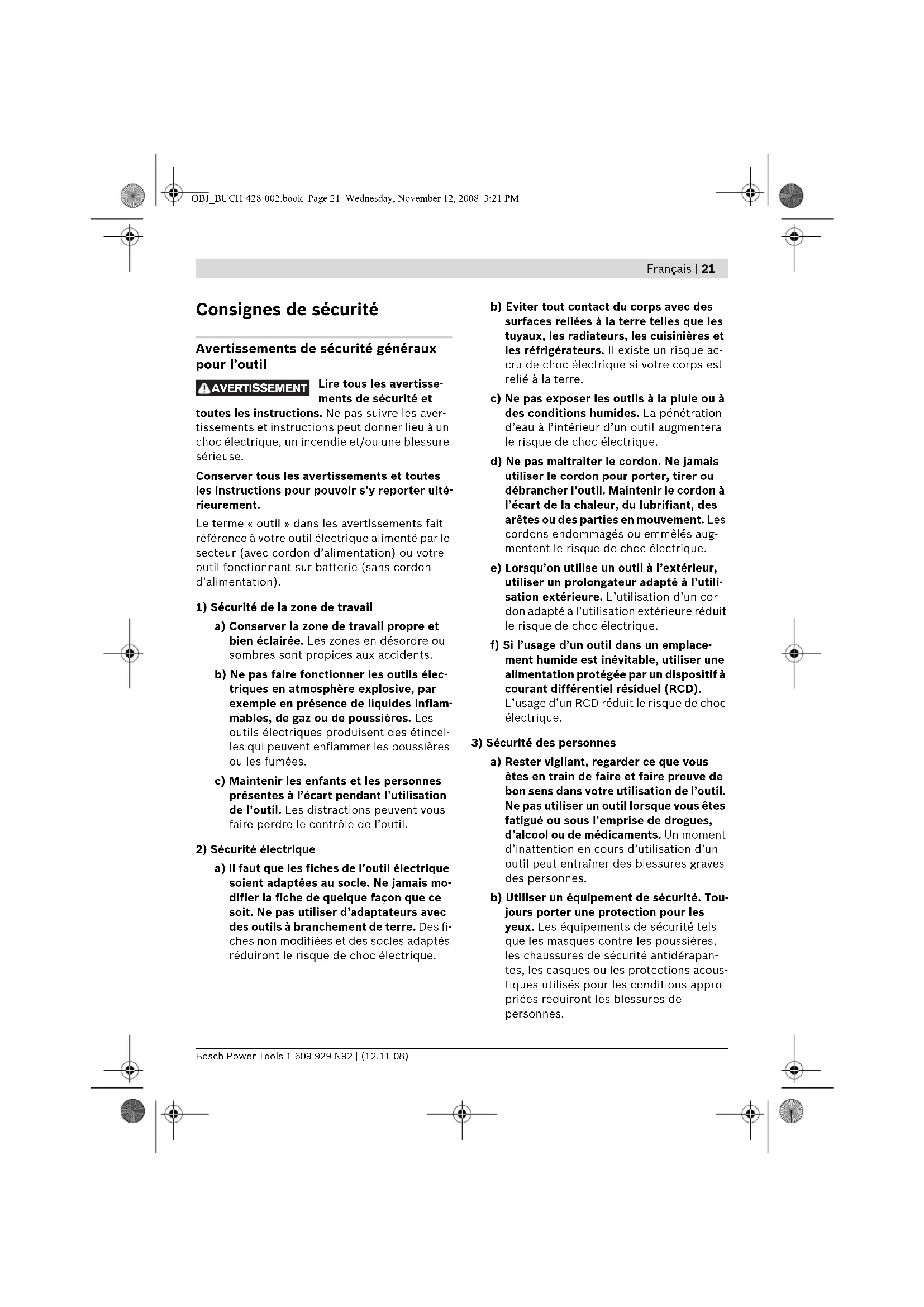 a) Rester vigilant, regarder ce que vous êtes en train de faire et faire preuve de bon sens dans votre utilisation de l’outil. Ne pas utiliser un outil lorsque vous êtes fatigué ou sous l’emprise de drogues, d’alcool ou de médicaments. Un moment d’inattention en cours d’utilisation d’un outil peut entraîner des blessures graves des personnes. b) Utiliser un équipement de sécurité. Tou- jours porter une protection pour les yeux. Les équipements de sécurité tels que les masques contre les poussières, les chaussures de sécurité antidérapan- tes, les casques ou les protections acous- tiques utilisés pour les conditions appro- priées réduiront les blessures de personnes. AVERTISSEMENT OBJ_BUCH-428-002.book Page 21 Wednesday, November 12, 2008 3:21 PM22 | Français 1 609 929 N92 | (12.11.08) Bosch Power Tools c) Eviter tout démarrage intempestif. S’as- surer que l’interrupteur est en position arrêt avant de brancher l’outil au secteur et/ou au bloc de batteries, de le ramas- ser ou de le porter. Porter les outils en ayant le doigt sur l’interrupteur ou bran- cher des outils dont l’interrupteur est en position marche est source d’accidents. d) Retirer toute clé de réglage avant de mettre l’outil en marche. Une clé laissée fixée sur une partie tournante de l’outil peut donner lieu à des blessures de per- sonnes. e) Ne pas se précipiter. Garder une posi- tion et un équilibre adaptés à tout mo- ment. Cela permet un meilleur contrôle de l’outil dans des situations inattendues. f) S’habiller de manière adaptée. Ne pas porter de vêtements amples ou de bi- joux. Garder les cheveux, les vêtements et les gants à distance des parties en mouvement. Des vêtements amples, des bijoux ou les cheveux longs peuvent être pris dans des parties en mouvement. g) Si des dispositifs sont fournis pour le raccordement d’équipements pour l’ex- traction et la récupération des poussiè- res, s’assurer qu’ils sont connectés et correctement utilisés. Utiliser des collec- teurs de poussière peut réduire les ris- ques dus aux poussières.