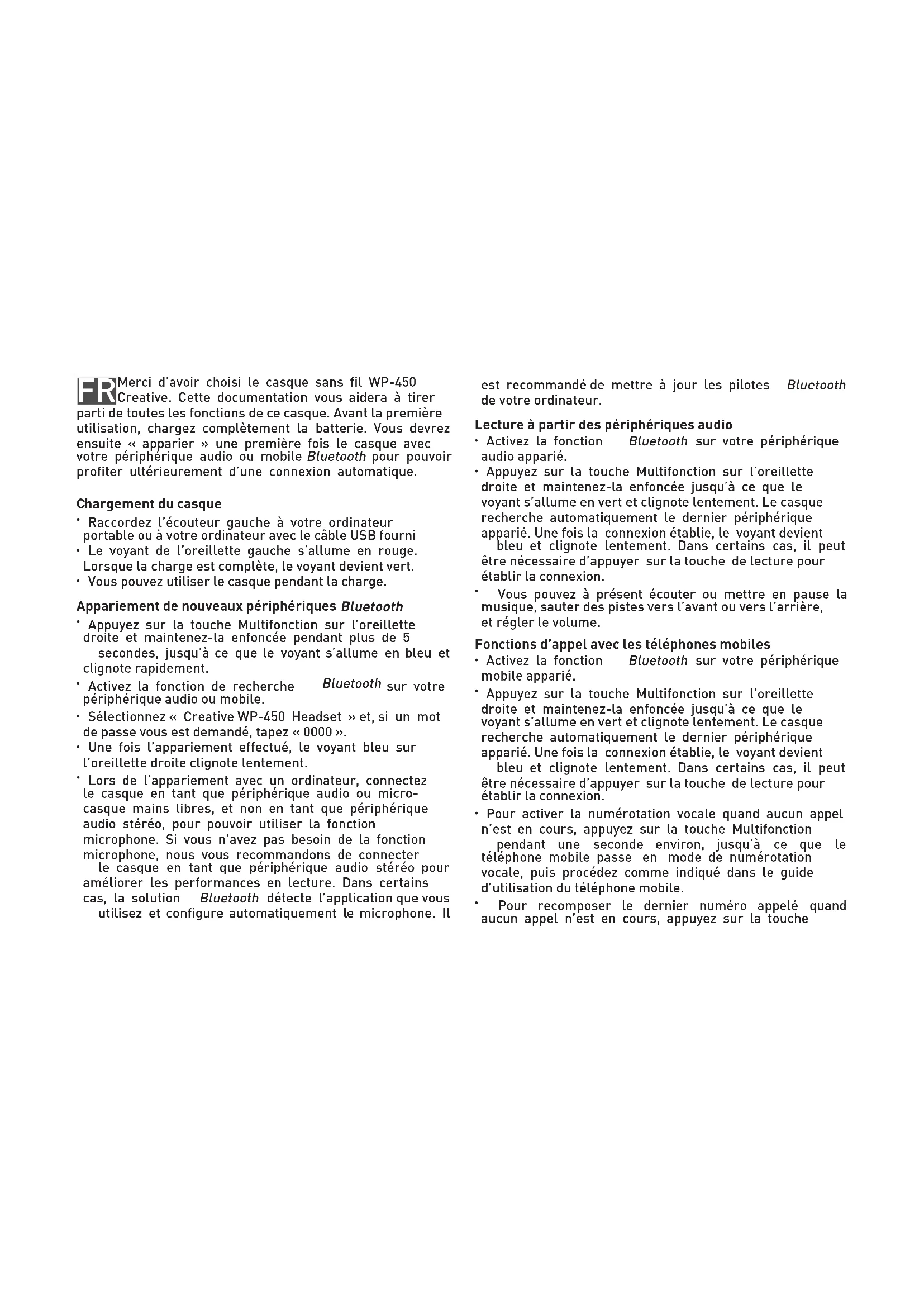 Net Weight: 114g / 4ozFR Merci d’avoir choisi le casque sans fil WP-450 Creative. Cette documentation vous aidera à tirer parti de toutes les fonctions de ce casque. Avant la première utilisation, chargez complètement la batterie. Vous devrez ensuite « apparier » une première fois le casque avec votre périphérique audio ou mobile Bluetooth pour pouvoir profiter ultérieurement d’une connexion automatique. Chargement du casque