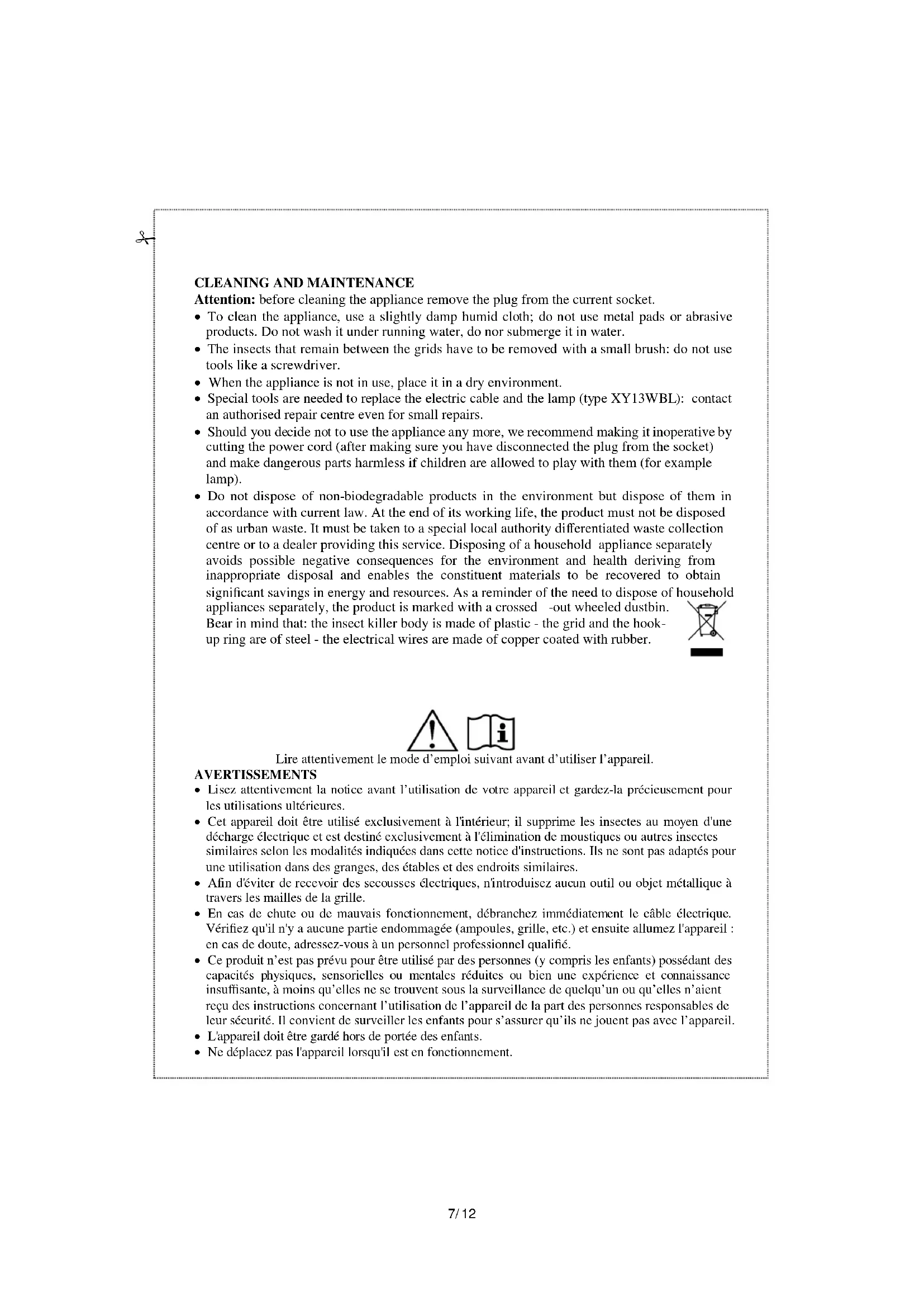 Attention: avant de nettoyer l'appareil, éteignez-le et extrayez la fiche de la prise de courant. Pour le nettoyage du tueur d'insectes, utiliser un chiffon doux, légèrement humecté d'eau: ne pas utiliser de paille de fer ou de produit abrasif, ne pas utiliser d'eau ou autres liquides et ne pas immerger l'appareil. Se servir d'une petite brosse pour enlever les insectes restés emprisonnés entre les mailles de la grille: éviter d'utiliser des outils tels que le tournevis. Lorsque vous n'utilisez pas l'appareil, placez-le dans un endroit sec. Pour substituer le cordon électrique et la lampe (type XY13WBL), il faut un outil spécial: on doit s’adresser à un centre d’assistance autorisé de même que pour d’éventuelles réparations. Si vous ne voulez plus utiliser l'appareil, désactivez-le en coupant le câble d'alimentation (assurez- vous d'abord d'avoir débranché la fiche de la prise de secteur) et en rendant inoffensives les parties susceptibles d'être dangereuses si des enfants s'en servent pour jouer (par exemple l'ampoule). Ne pas déverser dans l'environnement des produits qui ne sont pas biodégradables, mais les éliminer dans le respect des réglementations en vigueur. Au terme de son utilisation, le produit ne doit pas ĕtre ĕliminé avec les déchets urbains. Le produit doit ĕtre remis à l’un des centres de collecte sélective prévus par l’administration communale ou auprĕs des revendeus assurant ce service. Éliminer séparément un appareil électroménager permet d’éviter les retombées négatives pour l’environnement et la santé dérivant d’une élimination incorrecte, et permet de récupérer les matériaux qui le composent dans le but d’une économie importante en termes d’énergie et de ressources. Pour rappeler l’obligation d’éliminer séparément les appareils électroménagers, le produit porte le symbole d’un caisson à ordures barré. Attention : le corps du désinsectiseur est en plastique- les mailles de la grille et le crochet sont en métal- les conducteurs électriques sont en cuivre recouvert de caoutchouc.