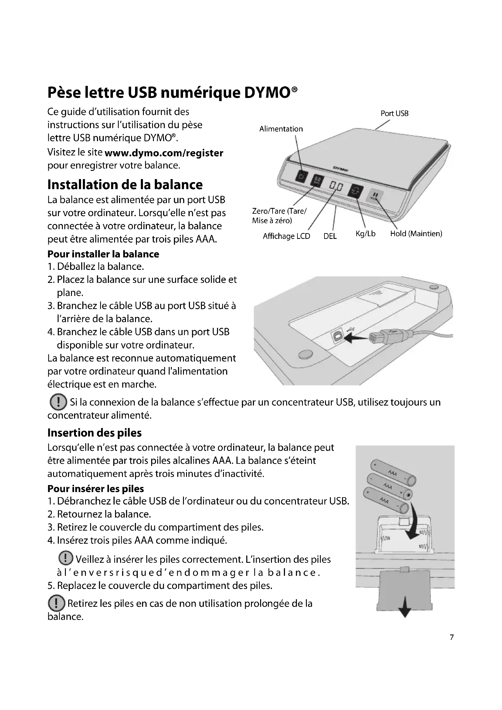 Visitez le site www.dymo.com/register pour enregistrer votre balance. Installation de la balance La balance est alimentée par un port USB sur votre ordinateur. Lorsqu’elle n’est pas connectée à votre ordinateur, la balance peut être alimentée par trois piles AAA.Pour installer la balance1. Déballez la balance.2. Placez la balance sur une surface solide et plane.3. Branchez le câble USB au port USB situé à l’arrière de la balance.4. Branchez le câble USB dans un port USB disponible sur votre ordinateur.La balance est reconnue automatiquement par votre ordinateur quand l'alimentation électrique est en marche.Si la connexion de la balance s’effectue par un concentrateur USB, utilisez toujours un concentrateur alimenté. Insertion des piles Lorsqu’elle n’est pas connectée à votre ordinateur, la balance peut être alimentée par trois piles alcalines AAA. La balance s’éteint automatiquement après trois minutes d’inactivité.Pour insérer les piles1. Débranchez le câble USB de l’ordinateur ou du concentrateur USB.2. Retournez la balance.3. Retirez le couvercle du compartiment des piles.4. Insérez trois piles AAA comme indiqué. Veillez à insérer les piles correctement. L’insertion des piles àl’enversrisqued’endommager la balance.5. Replacez le couvercle du compartiment des piles. Retirez les piles en cas de non utilisation prolongée de la balance. Alimentation Affichage LCDKg/LbHold (Maintien)Zero/Tare (Tare/Mise à zéro)Port USB DEL