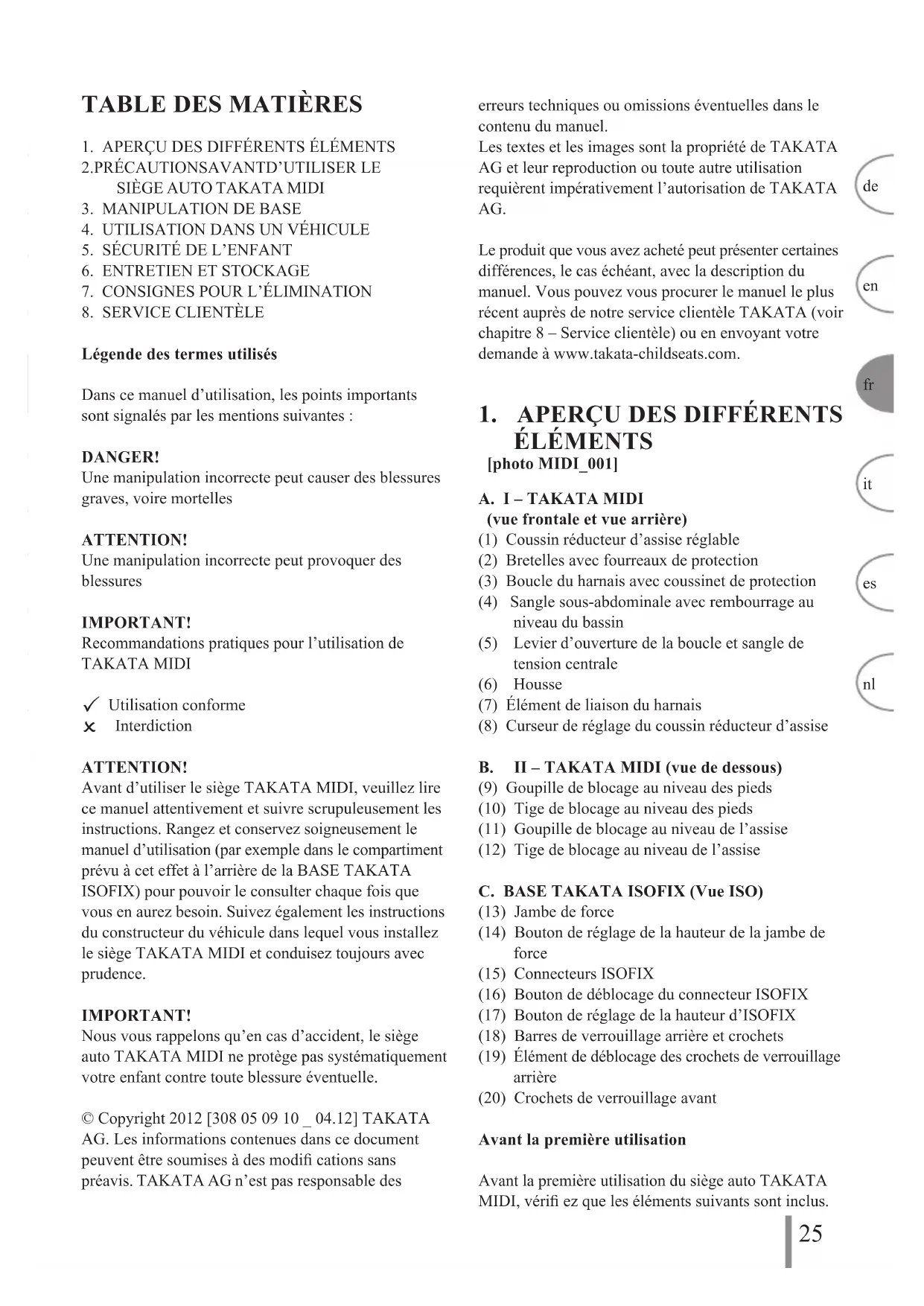 Interdiction ATTENTION! Avant dʼutiliser le siège TAKATA MIDI, veuillez lire ce manuel attentivement et suivre scrupuleusement les instructions. Rangez et conservez soigneusement le manuel d’utilisation (par exemple dans le compartiment prévu à cet effet à lʼarrière de la BASE TAKATA ISOFIX) pour pouvoir le consulter chaque fois que vous en aurez besoin. Suivez également les instructions du constructeur du véhicule dans lequel vous installez le siège TAKATA MIDI et conduisez toujours avec prudence. IMPORTANT! Nous vous rappelons qu’en cas dʼaccident, le siège auto TAKATA MIDI ne protège pas systématiquement votre enfant contre toute blessure éventuelle. © Copyright 2012 [308 05 09 10 _ 04.12] TAKATA AG. Les informations contenues dans ce document peuvent être soumises à des modifi cations sans préavis. TAKATA AG nʼest pas responsable des erreurs techniques ou omissions éventuelles dans le contenu du manuel. Les textes et les images sont la propriété de TAKATA AG et leur reproduction ou toute autre utilisation requièrent impérativement l’autorisation de TAKATA AG. Le produit que vous avez acheté peut présenter certaines différences, le cas échéant, avec la description du manuel. Vous pouvez vous procurer le manuel le plus récent auprès de notre service clientèle TAKATA (voir