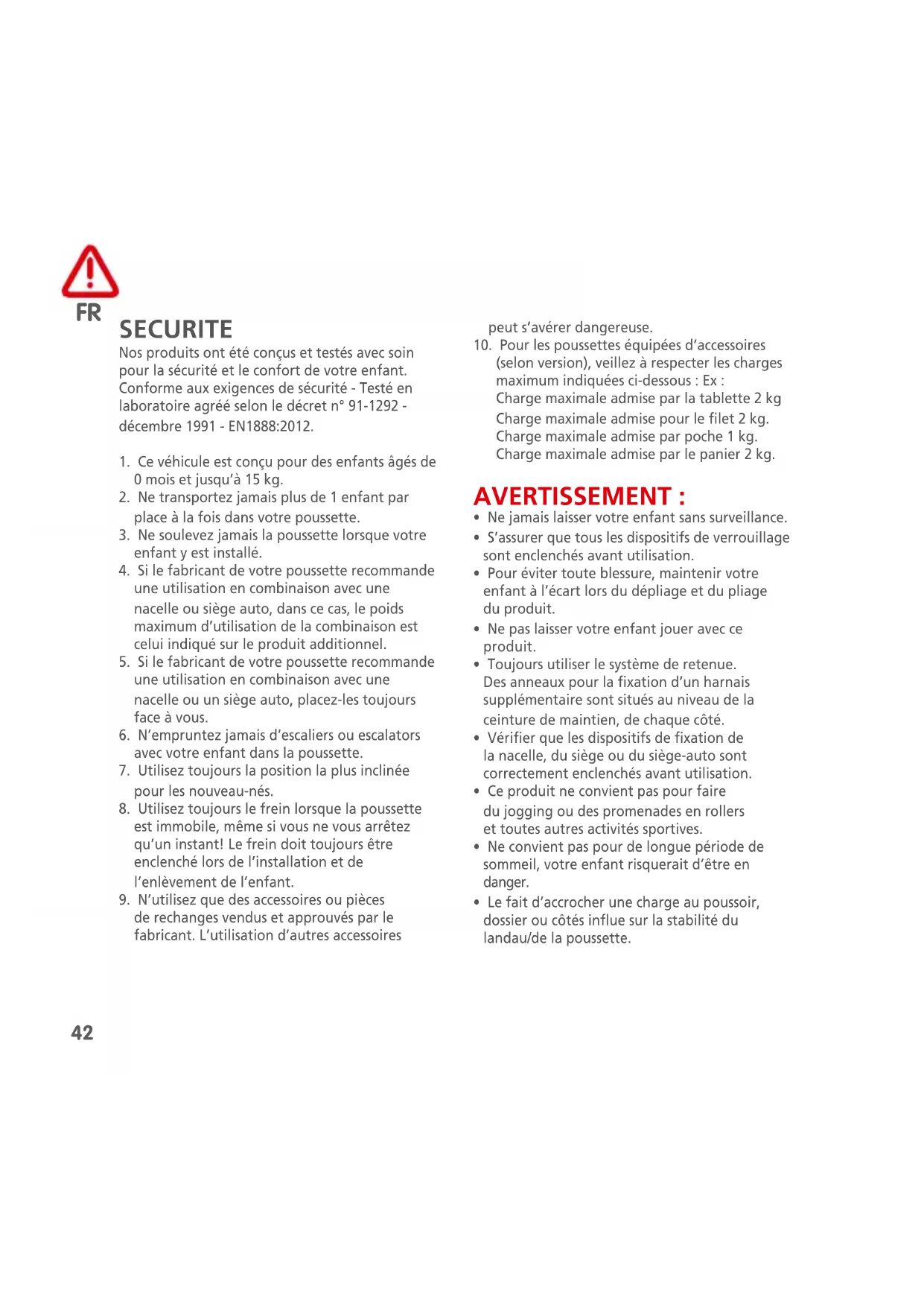 SECURITE Nos produits ont été conçus et testés avec soin pour la sécurité et le confort de votre enfant. Conforme aux exigences de sécurité - Testé en laboratoire agréé selon le décret n° 91-1292 - décembre 1991 - EN1888:2012.
