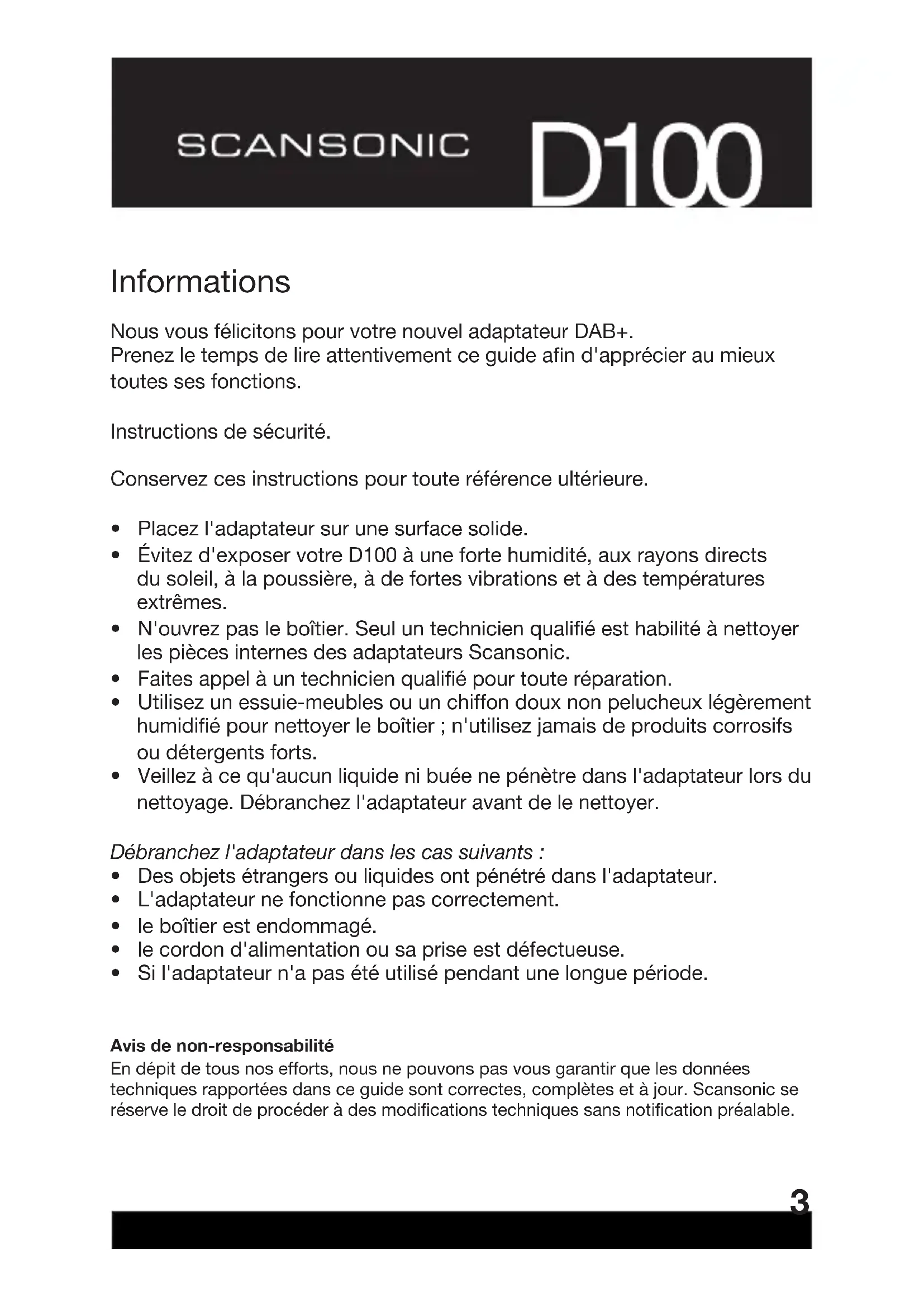 D100 - Radio SCANSONIC - Notice d'utilisation et mode d'emploi gratuit