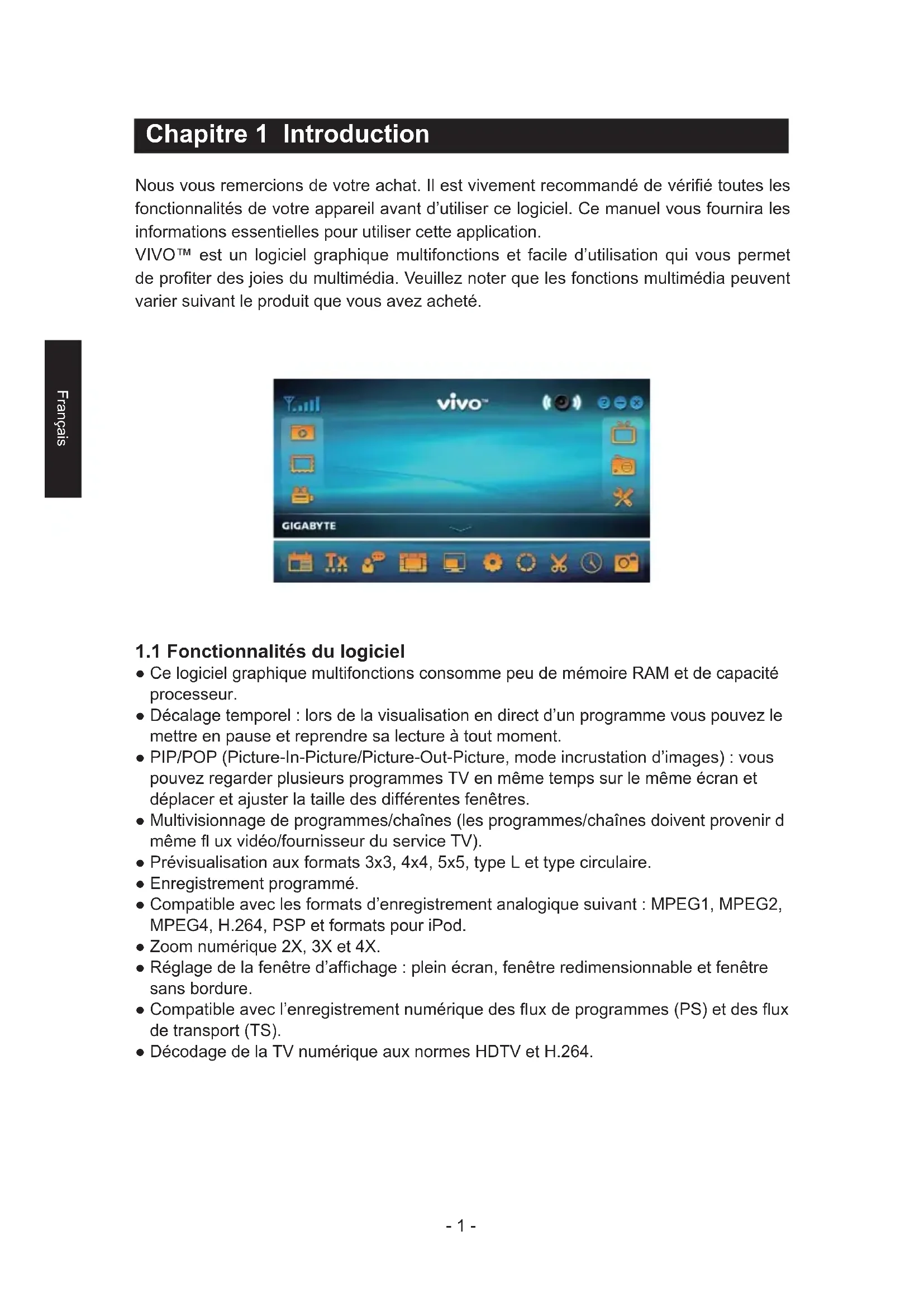 Nous vous remercions de votre achat. Il est vivement recommandé de vérifi é toutes les fonctionnalités de votre appareil avant d’utiliser ce logiciel. Ce manuel vous fournira les informations essentielles pour utiliser cette application. VIVO™ est un logiciel graphique multifonctions et facile d’utilisation qui vous permet de profi ter des joies du multimédia. Veuillez noter que les fonctions multimédia peuvent varier suivant le produit que vous avez acheté.