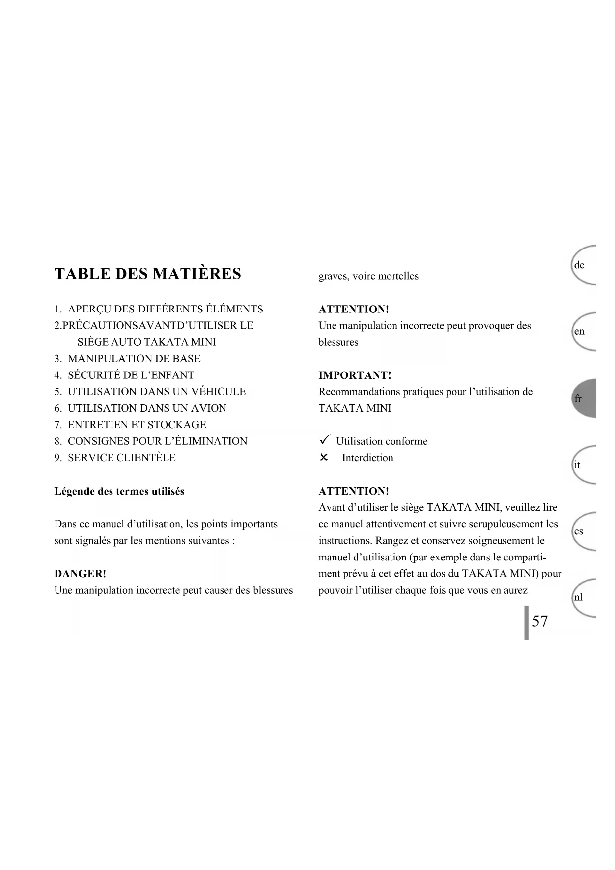 en58 besoin. Suivez également les instructions du constructeur du véhicule dans lequel vous installez TAKATA MINI et conduisez toujours avec prudence. IMPORTANT! Nous vous rappelons qu’en cas dʼaccident, le siège auto TAKATA MINI ne protège pas systématiquement votre enfant contre toute blessure éventuelle. © Copyright 2012 [308 04 30 10 _ 04.12] TAKATA AG. Les informations contenues dans ce document peuvent être soumises à des modifi cations sans préavis. TAKATA AG nʼest pas responsable des erreurs techniques ou omissions éventuelles dans le contenu du manuel. Les textes et les images sont la propriété de TAKATA AG et leur reproduction ou toute autre utilisation requièrent impérativement l’autorisation de TAKATA AG. Le produit que vous avez acheté peut présenter certaines différences, le cas échéant, avec la descripti- on du manuel. Vous pouvez vous procurer le manuel le plus récent auprès de notre service clientèle TAKATA (voir chapitre 9 – Service clientèle) ou en envoyant votre demande à www.takata-childseats.com.