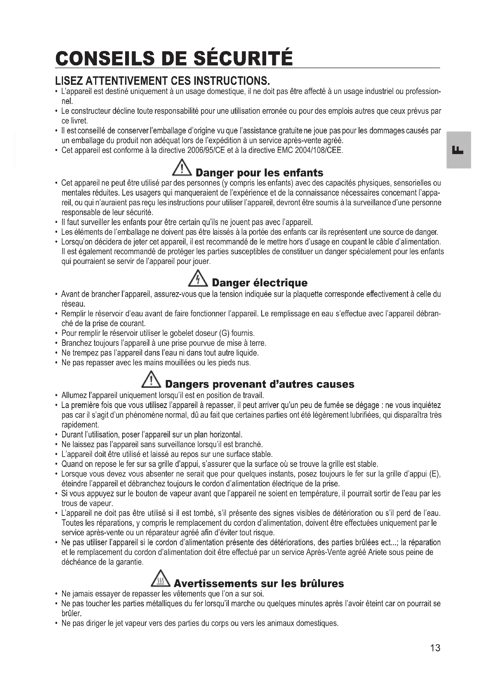 - Remplir le réservoir d’eau avant de faire fonctionner l’appareil. Le remplissage en eau s’effectue avec l’appareil débran- ché de la prise de courant.• Pour remplir le réservoir utiliser le gobelet doseur (G) fournis.• Branchez toujours l’appareil à une prise pourvue de mise à terre.• Ne trempez pas l’appareil dans l’eau ni dans tout autre liquide.• Ne pas repasser avec les mains mouillées ou les pieds nus. Dangers provenant d’autres causes