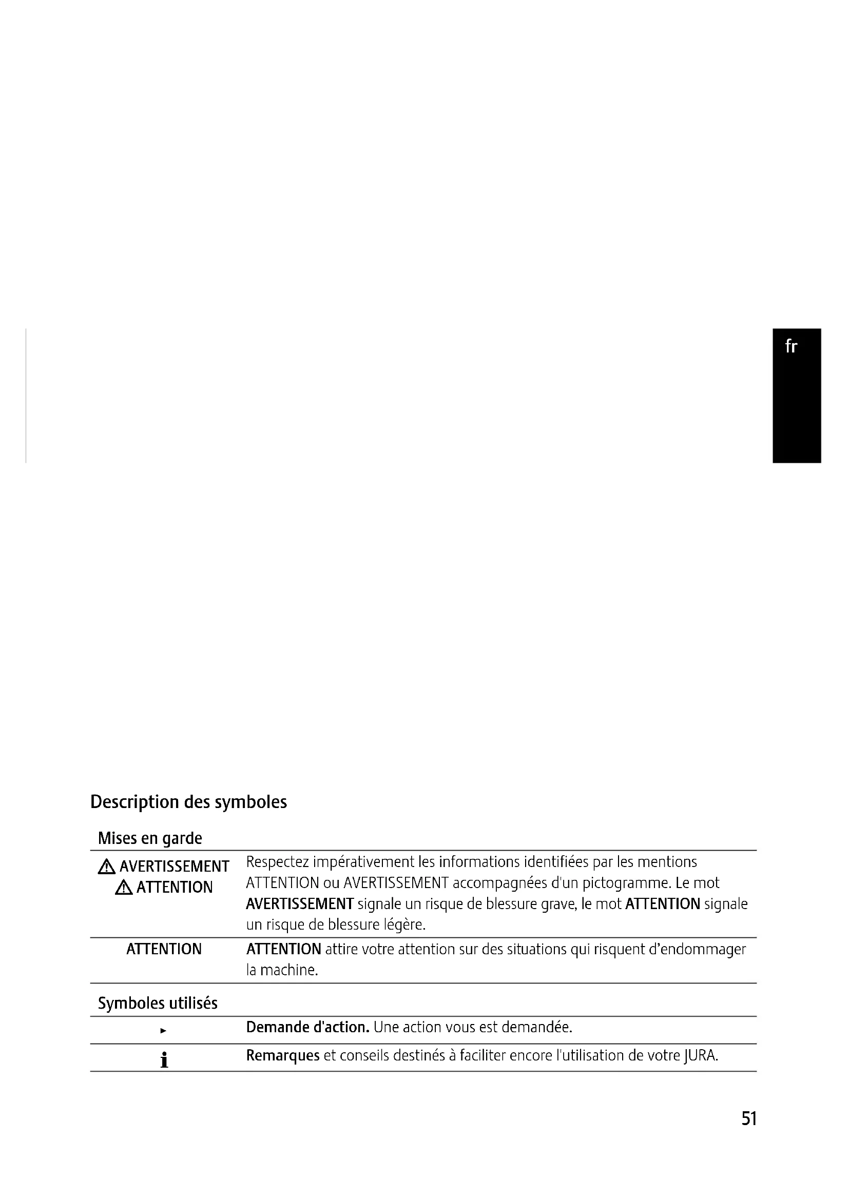 1 Visuel avec symboles & Symbole Détartrage ! Symbole Filtre L Symbole Nettoyage M Symbole Réservoir d'eau v Symbole Café moulu ? Symbole Récipient à marc de café ; Symbole Intensité du café «normal» _ Symbole Intensité du café «fort» Y Symbole Ristretto < Symbole Espresso > Symbole Café54 Remarques importantes Remarques importantes Utilisation conforme Cet appareil a été conçu et construit pour un usage domestique privé. Il sert exclusivement à préparer du café. Toute autre utilisation est considérée comme non conforme. La société JURA Elektroapparate AG décline toute responsabilité relative aux conséquences d'une utilisation non conforme. Lisez entièrement ce mode d'emploi avant d'utiliser la machine et res- pectez-le scrupuleusement. Aucune prestation de garantie ne pourra être invoquée pour des dommages ou défauts résultant du non-respect du mode d'emploi. Conservez ce mode d'emploi à proximité de la machine et remettez-le aux utilisa- teurs suivants. Pour votre sécurité Lisez attentivement les importantes consignes de sécurité suivantes et respectez-les scrupuleusement. Voici comment éviter tout risque d'électrocution: