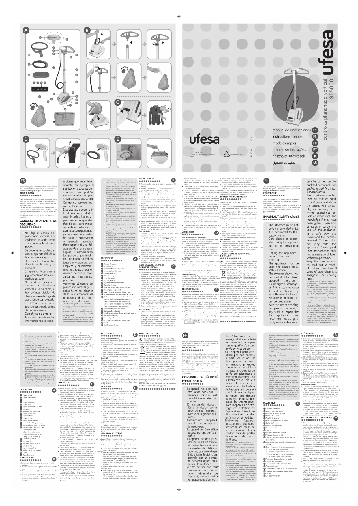 centro de planchado vertical ST5000 381-01B_v02 39-14100% recycled paperBSH Electrodomésticos España, S.A.C.I.F. : A-28-893550C/ Itaroa, nº 1, 31.620 HUARTE (Navarra)España Thank you for buying Ufesa garment steamer, carefully read through the operating instructions for the appliance and safeguard them for future reference.INTRODUCTIONThese instructions for use contain valuable information about the unique features of this steamer and some hints to make ironing easier for you.This appliance can be used on shirts & blouses, pants & skirts, dresses, coats, curtains & drapes, fabric furniture, table lines, it can also be used to kill dust mites, germs, bacteria and neutralize odor. This appliance complies with international safety standards.IMPORTANT SAFETY ADVICE The steamer must not be left unattended while it is connected to the supply mains. Care should be taken when using the appliance due to the emission of steam. Unplug the appliance during filling and cleaning. The appliance must be used and placed on a stable surface. The steamer should not be used if it has been dropped, if there are visible signs of damage or if it is leaking water. It must be checked by an authorized Technical Service Centre before it can be used again. With the aim of avoiding dangerous situations, any work or repair that the appliance may need, e.g. replacing a faulty mains cable, must Gracias por adquirir el centro de planchado vertical de Ufesa, lea cuidadosamente las instrucciones de funcionamiento para este aparato y guárdelas para futuras referencias.INTRODUCCIÓNEstas instrucciones de uso contienen información valiosa sobre las características exclusivas de este centro de planchado vertical y algunos consejos para hacerle más fácil el planchado.Este aparato puede usarse en camisas y blusas, pantalones y faldas, vestidos, chaquetas, cortinas muebles de tela, manteles. También puede usarse para eliminar ácaros del polvo, gérmenes, bacterias y neutralizar el mal olor. Este aparato cumple con las normas internacionales de seguridad.CONSEJO IMPORTANTE DE SEGURIDAD No deje el centro de planchado vertical sin vigilancia cuando esté conectada a la alimen-tación. Se debe tener cuidado al usar el aparato debido a la emisión de vapor. Desconecte el aparato durante el llenado y la limpieza. El aparato debe usarse y guardarse en una su-perficie estable. No se debe utilizar el centro de planchado vertical si se ha caído, si hay señales visibles de daños o si existe fuga de agua. Debe ser revisada en el Centro de servicio técnico autorizado antes de volver a usarla. Con objeto de evitar si-tuaciones de peligro, las intervenciones o repa- Nous vous remercions d'avoir choisi un défroisseur vapeur Ufesa. Veuillez lire attentivement cette notice d’utilisation et la conserver pour toute référence ultérieure.INTRODUCTION Cette notice contient des informations essentielles pour vous aider à bien connaître les fonctionnalités exclusives de votre défroisseur vapeur et des conseils pour vous faciliter le repassage. Cet appareil peut être utilisé pour les chemises et chemisiers, pantalons et jupes, robes, manteaux, rideaux et tentures, tissus d’ameublement, nappes. Il peut également servir à éliminer les acariens, les germes, les bactéries et à neutraliser les odeurs.Cet appareil est conforme aux normes de sécurité internationales.CONSIGNES DE SÉCURITÉ IMPORTANTES L’appareil ne doit pas être laissé sans sur-veillance lorsqu'il est branché à une prise de courant. En raison des risques liés à l’émission de va-peur, utilisez l’appareil avec la plus grande pru-dence. Débranchez l’appareil lors du remplissage et du nettoyage. L’appareil doit être utilisé et posé sur une surface stable. L'appareil ne doit plus être utilisé s’il est tombé, s’il présente des signes manifestes de détério-ration ou une fuite d’eau. Il doit faire l’objet d'un contrôle par un centre de services agréé pour pouvoir le réutiliser. À titre de sécurité, toute intervention ou répa-ration nécessaire de l’appareil, notamment le remplacement d’un cor-only be carried out by qualified personnel from an Authorized Technical Service Centre. This appliance can be used by children aged from 8 years and above and persons with reduced physical, sensory or mental capabilities or lack of experience and knowledge if they have been given supervision or instruction concerning use of the appliance in a safe way and understand the hazards involved. Children shall not play with the appliance. Cleaning and user maintenance shall not be made by children without supervision. Keep the steamer and its cord out of reach of children less than 8 years of age when it is energized or cooling down. This appliance is to be connected and used in accordance with the information stated on its characteristics plate. This appliance must be connected to an earthed socket. If it is absolutely necessary to use an extension cable, make sure that it is suitable for 16A and has a socket with an earth connection. If the safety fuse fitted in the appliance blows, the appliance will be rendered inoperative. To restore normal operation the appliance will have to be taken to an authorized Technical Service Centre. In order to avoid that, under unfavorable mains conditions, phenomena like transient voltage drops or lighting fluctuations can happen, it is recommended that the steamer is connected to a power supply system with a maximum impedance of 0.27Ω. If necessary, the user can ask the public power supply company for the system impedance at the interface point. Unplug the appliance from the mains supply after each use, or if a fault is suspected.don d’alimentation défec-tueux, doit être eectuée exclusivement par le per-sonnel qualifié d’un cen-tre de services agréé. Cet appareil peut être utilisé par des enfants à partir de 8 ans et des personnes avec un handicap physique, sensoriel ou mental ou manquant d