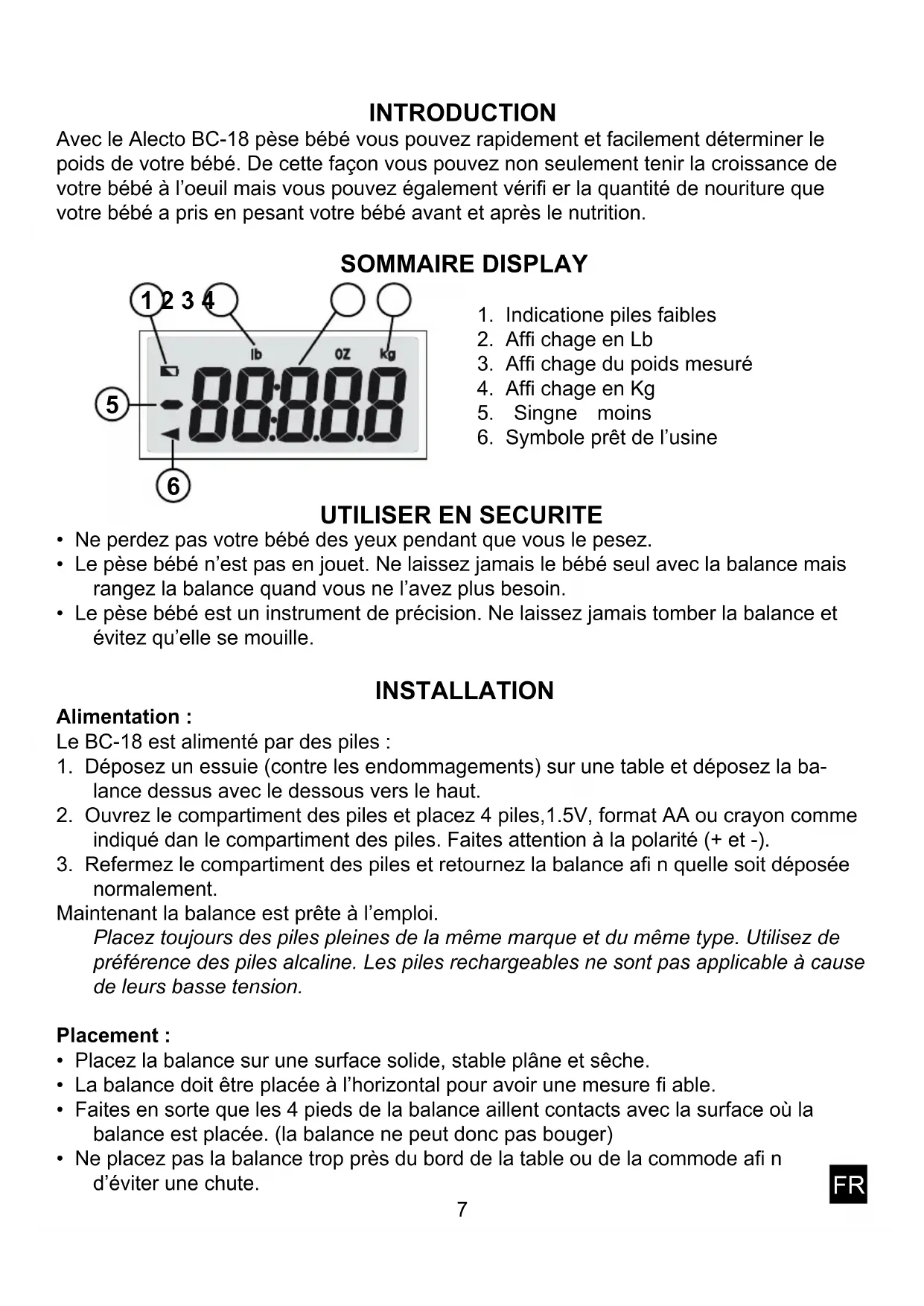 FR10 SPECIFICATIONS Alimentation : ....................................... 4 piles de 1,5Volt, format AA ou crayon Poids de charge maximal : .................. 20 Kg Le poids minimal mesurable : .............. 50 gram Resolution :.......................................... 10 gram Tolérance : ........................................... 5% Af chage :............................................ Kg/Lb Température de fonctionnement : ........ 5ºC ~ 30ºC Température de conservation : ............ 10ºC ~ 60ºC Le BC-18 n’est pas prévu pour des ns commerciales.