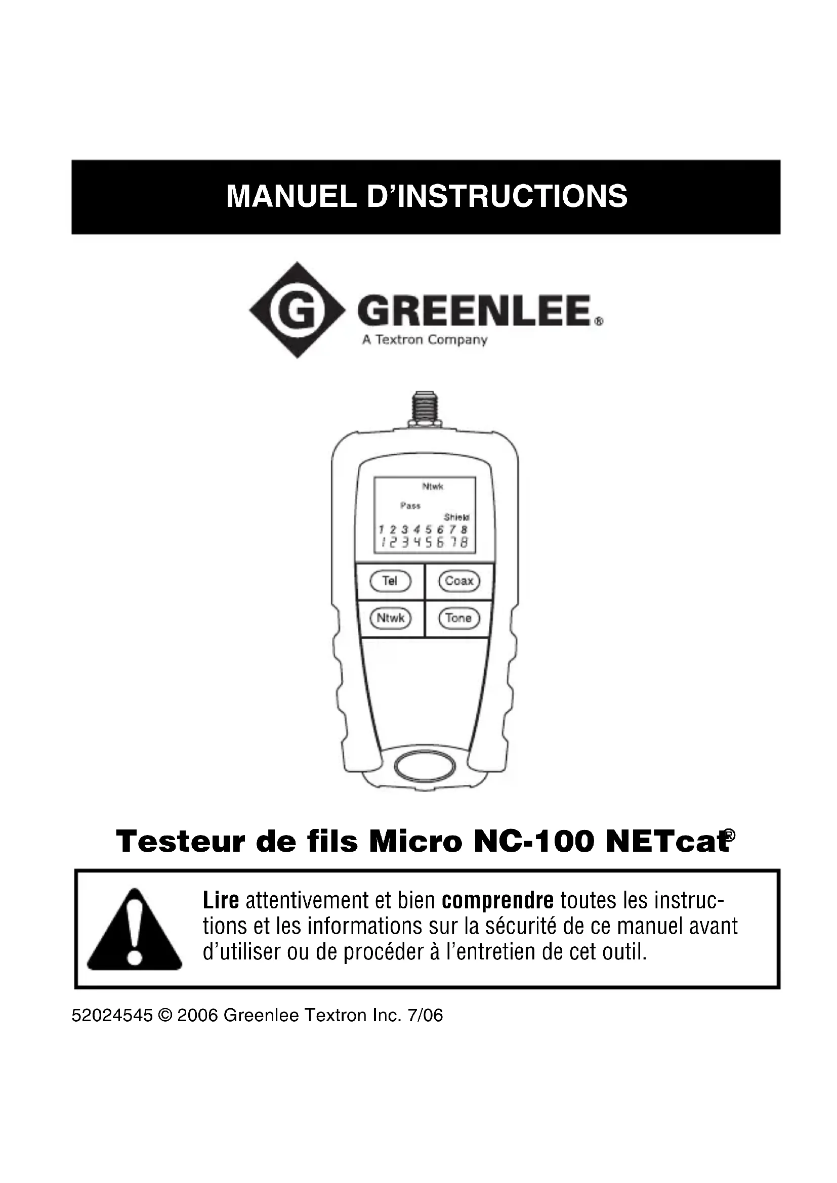Greenlee. Mettre ce manuel à la disposition de tous les employés. On peut obtenir des exemplaires gratuits sur simple demande. Toutes les spécifications sont nominales et sujettes à des modifications lorsque la conception est améliorée. Greenlee Textron Inc. ne peut être responsable pour des dommages résultant d’une application incorrecte ou d’une mauvaise utilisation de ses produits. NETcat est une marque de commerce déposée de Tempo Research Corp.NC-100 NETcat