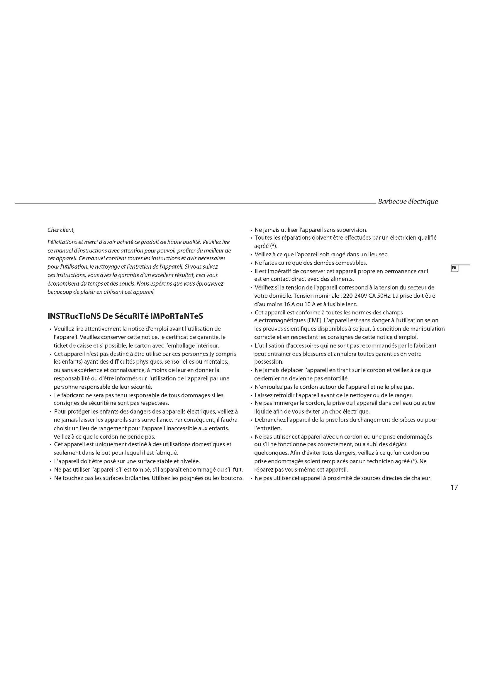 - Ne pas utiliser cet appareil à proximité de sources directes de chaleur. Barbecue électrique FR18