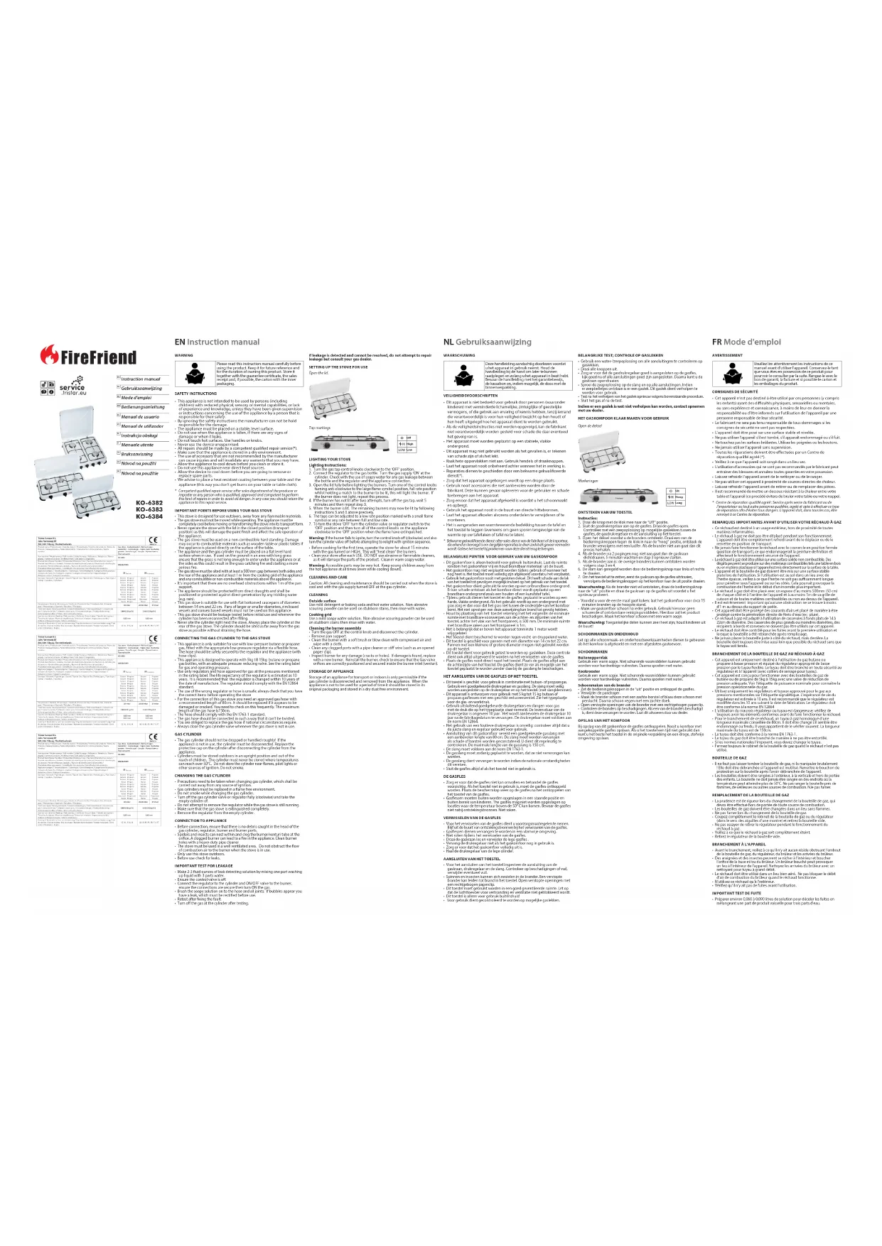 - Turn o the gas at the cylinder after testing. EN Instruction manual NL Gebruiksaanwijzing FR Mode d'emploi AVERTISSEMENT Veuillez lire attentivement les instructions de ce manuel avant d'utiliser l’appareil. Conservez-le tant que vous êtes en possession de ce produit pour pourvoir le consulter par la suite. Rangez-le avec le bon de garanti, la facture et si possible le carton et les emballages du produit.