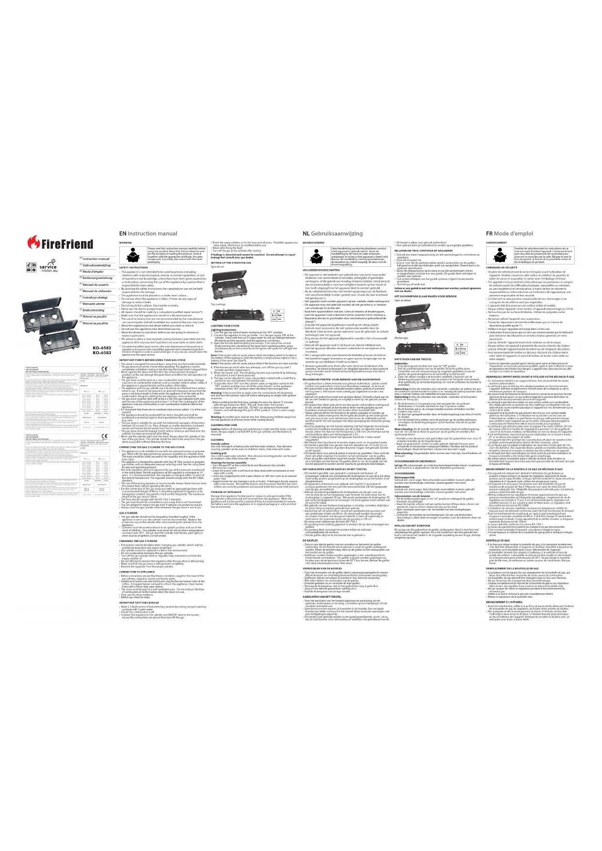- Connect the regulator to the cylinder and ON/OFF valve to the burner, ensure the connections are secure then turn ON the gas. EN Instruction manual NL Gebruiksaanwijzing FR Mode d'emploi AVERTISSEMENT Veuillez lire attentivement les instructions de ce manuel avant d'utiliser l’appareil. Conservez-le tant que vous êtes en possession de ce produit pour pourvoir le consulter par la suite. Rangez-le avec le bon de garanti, la facture et si possible le carton et les emballages du produit.
