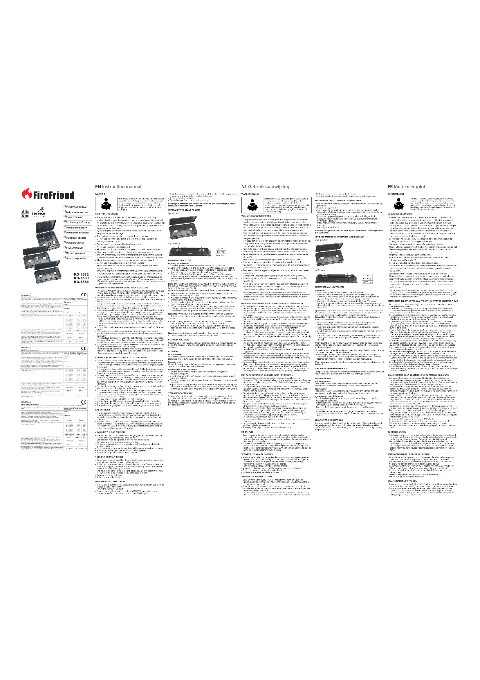 - Connect the regulator to the cylinder and ON/OFF valve to the burner, ensure the connections are secure then turn ON the gas. EN Instruction manual NL Gebruiksaanwijzing FR Mode d'emploi AVERTISSEMENT Veuillez lire attentivement les instructions de ce manuel avant d'utiliser l’appareil. Conservez-le tant que vous êtes en possession de ce produit pour pourvoir le consulter par la suite. Rangez-le avec le bon de garanti, la facture et si possible le carton et les emballages du produit.