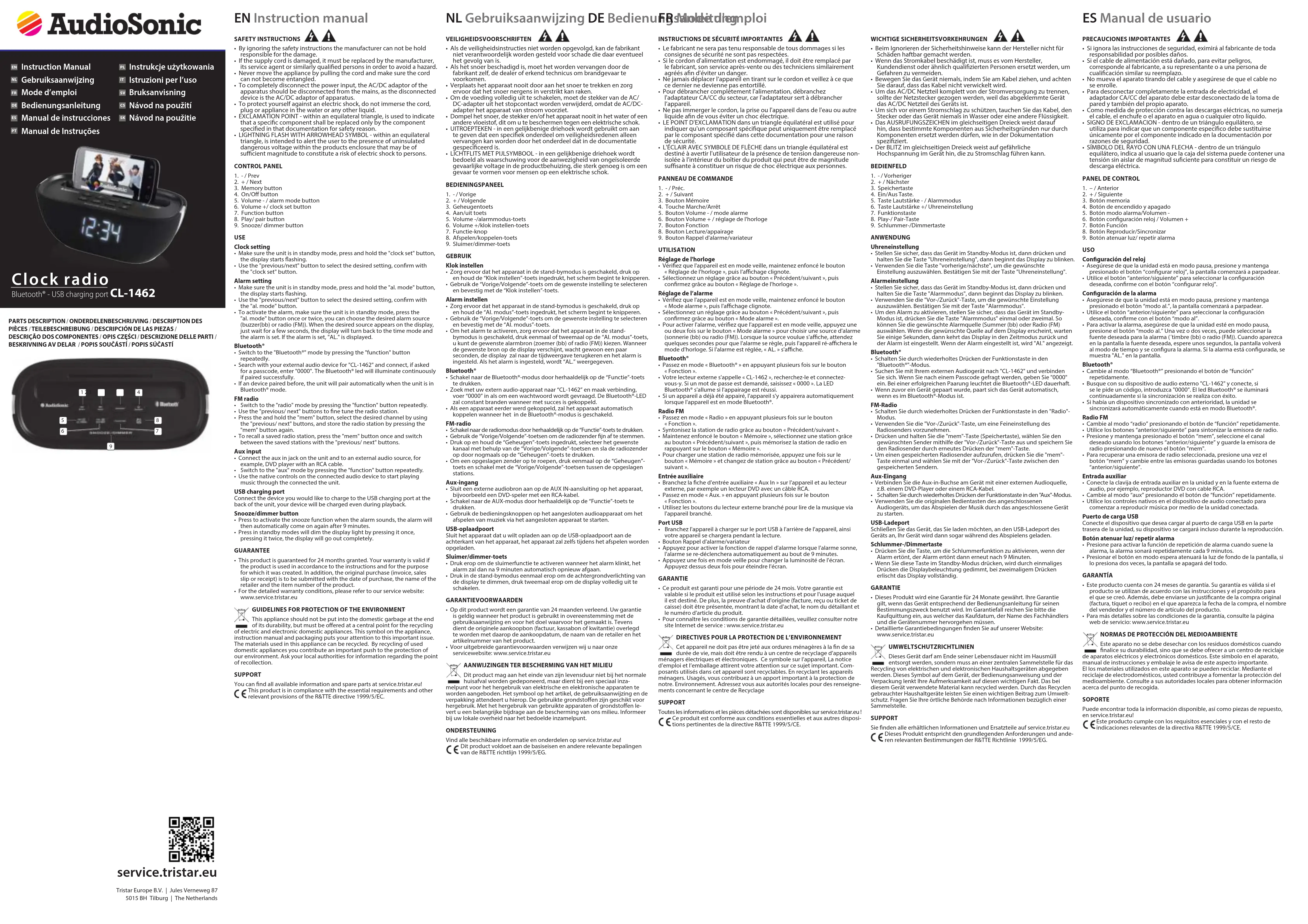 INSTRUCTIONS DE SÉCURITÉ IMPORTANTES• Le fabricant ne sera pas tenu responsable de tous dommages si les consignes de sécurité ne sont pas respectées.• Si le cordon d'alimentation est endommagé, il doit être remplacé par le fabricant, son service après-vente ou des techniciens similairement agréés an d'éviter un danger.• Ne jamais déplacer l’appareil en tirant sur le cordon et veillez à ce que ce dernier ne devienne pas entortillé.• Pour débrancher complètement l'alimentation, débranchez l'adaptateur CA/CC du secteur, car l'adaptateur sert à débrancher l’appareil.• Ne pas immerger le cordon, la prise ou l'appareil dans de l'eau ou autre liquide an de vous éviter un choc électrique.• LE POINT D'EXCLAMATION dans un triangle équilatéral est utilisé pour indiquer qu'un composant spécique peut uniquement être remplacé par le composant spécié dans cette documentation pour une raison de sécurité.• L'ÉCLAIR AVEC SYMBOLE DE FLÈCHE dans un triangle équilatéral est destiné à avertir l'utilisateur de la présence de tension dangereuse non-isolée à l'intérieur du boîtier du produit qui peut être de magnitude susante à constituer un risque de choc électrique aux personnes.PANNEAU DE COMMANDE1. - / Préc.2. + / Suivant3. Bouton Mémoire4. Touche Marche/Arrêt5. Bouton Volume- / mode alarme6. Bouton Volume+ / réglage de l'horloge7. Bouton Fonction8. Bouton Lecture/appairage9. Bouton Rappel d'alarme/variateurUTILISATION Réglage de l'horloge• Vériez que l'appareil est en mode veille, maintenez enfoncé le bouton «Réglage de l'horloge», puis l'achage clignote.• Sélectionnez un réglage grâce au bouton «Précédent/suivant», puis conrmez grâce au bouton «Réglage de l'horloge». Réglage de l’alarme• Vériez que l'appareil est en mode veille, maintenez enfoncé le bouton «Mode alarme», puis l'achage clignote.• Sélectionnez un réglage grâce au bouton «Précédent/suivant», puis conrmez grâce au bouton «Mode alarme». • Pour activer l'alarme, vériez que l'appareil est en mode veille, appuyez une ou deux fois sur le bouton «Mode alarme» pour choisir une source d'alarme (sonnerie (bb) ou radio (FM)). Lorsque la source voulue s'ache, attendez quelques secondes pour que l'alarme se règle, puis l'appareil ré-achera le mode d'horloge. Si l'alarme est réglée, «AL.» s'ache. Bluetooth®• Passez en mode «Bluetooth®» en appuyant plusieurs fois sur le bouton «Fonction». • Votre lecteur externe s'appelle «CL-1462», recherchez-le et connectez-vous-y. Si un mot de passe est demandé, saisissez «0000». La LED Bluetooth® s'allume si l'appairage est réussi. • Si un appareil a déjà été appairé, l'appareil s'y appairera automatiquement lorsque l'appareil est en mode Bluetooth®. Radio FM• Passez en mode «Radio» en appuyant plusieurs fois sur le bouton «Fonction».• Syntonisez la station de radio grâce au bouton «Précédent/suivant».• Maintenez enfoncé le bouton «Mémoire», sélectionnez une station grâce au bouton «Précédent/suivant», puis mémorisez la station de radio en rappuyant sur le bouton «Mémoire». • Pour charger une station de radio mémorisée, appuyez une fois sur le bouton «Mémoire» et changez de station grâce au bouton «Précédent/suivant».Entrée auxiliaire• Branchez la che d'entrée auxiliaire «Aux In» sur l'appareil et au lecteur externe, par exemple un lecteur DVD avec un câble RCA.• Passez en mode «Aux.» en appuyant plusieurs fois sur le bouton «Fonction». • Utilisez les boutons du lecteur externe branché pour lire de la musique via l'appareil branché.Port USB