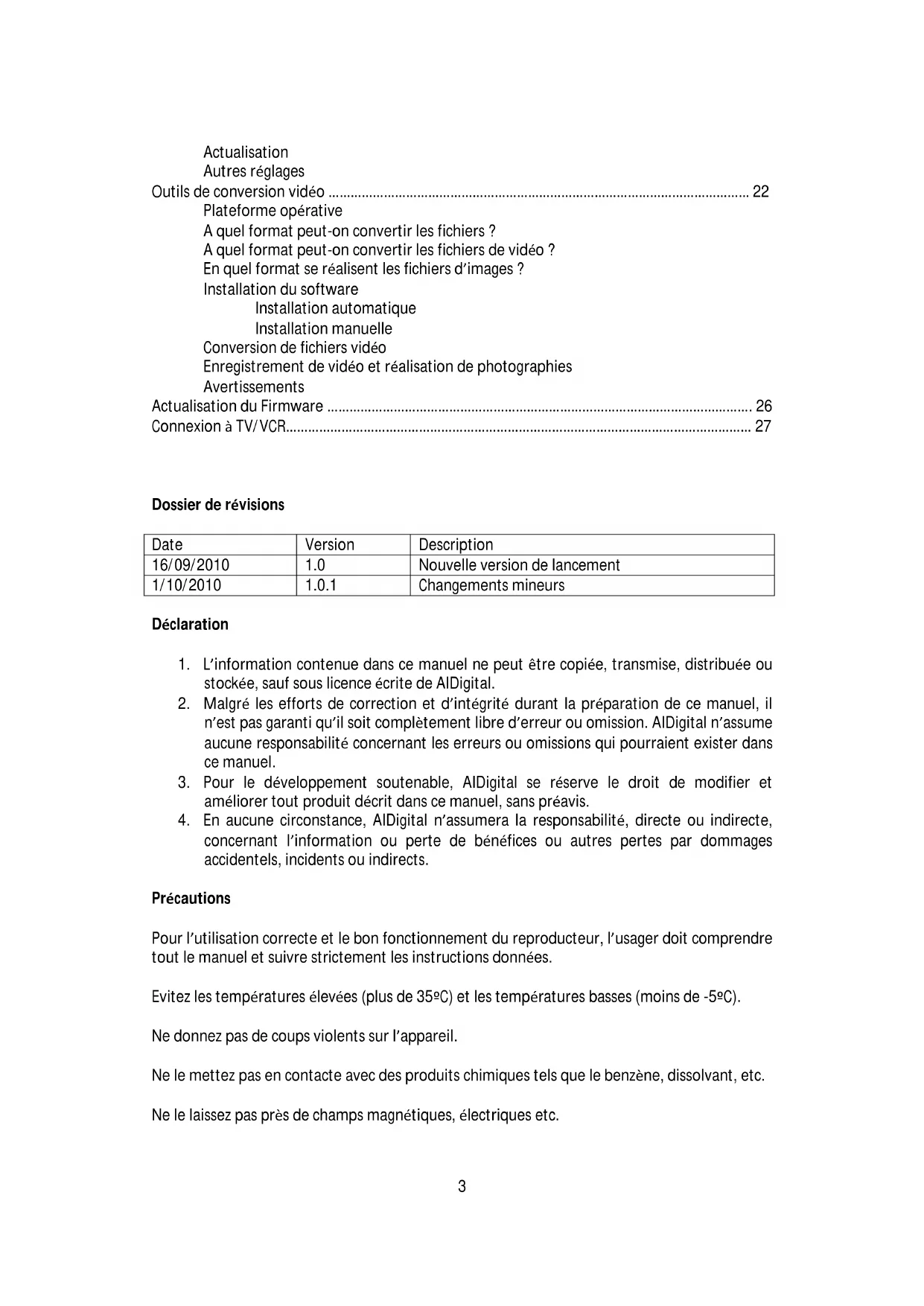 n’est pas garanti qu’il soit complètement libre d’erreur ou omission. AIDigital n’assume aucune responsabilité concernant les erreurs ou omissions qui pourraient exister dans ce manuel.