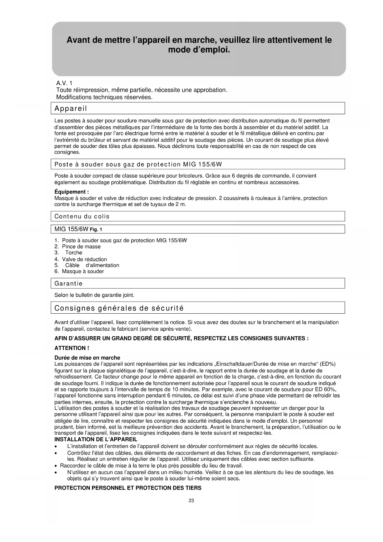 E-Mail: support@ts.guede.com 21EC Declaration of Conformity Güde GmbH & Co. KG We herewith declare, Birkichstraße 6, 74549 Wolpertshausen, Germany That the following Appliance complies with the appropriate basic safety and health requirements of the EC Directive based on its design and type, as brought into circulation by us. In a case of alternation of the machine, not agreed upon by us, this declaration will loose its validity. Machine desciption: - MIG 155 6W Article-No.: - 20072 Applicable EC Directives: - 98/37 EC - 2006/95/EC - 2004/108/EC Applicable harmonized Standard: - EN 60974-1 - EN 609784-10 Point of certification: TÜV Rheinland Product Safety GmbH, Am Grauen Stein, D-51105 Köln Date/Authorized Signature: 19.09.08 Title of Signatory: Hr. Arnold, Geschäftsführer 22Appareil Les postes à souder pour soudure manuelle sous gaz de protection avec distribution automatique du fil permettent d’assembler des pièces métalliques par l’intermédiaire de la fonte des bords à assembler et du matériel additif. La fonte est provoquée par l’arc électrique formé entre le matériel à souder et le fil métallique délivré en continu par l’extrémité du brûleur et servant de matériel additif pour le soudage des pièces. Un courant de soudage plus élevé permet de souder des tôles plus épaisses. Nous déclinons toute responsabilité en cas de non respect de ces consignes. Poste à souder sous gaz de protection MIG 155/6W Poste à souder compact de classe supérieure pour bricoleurs. Grâce aux 6 degrés de commande, il convient également au soudage problématique. Distribution du fil réglable en continu et nombreux accessoires. Équipement : Masque à souder et valve de réduction avec indicateur de pression. 2 coussinets à rouleaux à l’arrière, protection contre la surcharge thermique et set de tuyaux de 2 m. Contenu du colis MIG 155/6W Fig. 1