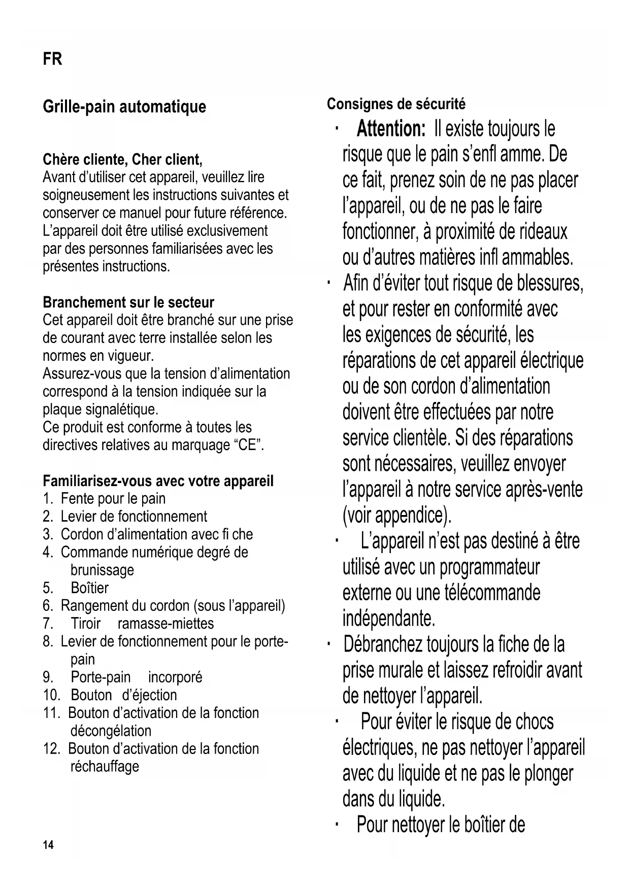 réchauffage Consignes de sécurité ∙ Attention : Il existe toujours le risque que le pain s’enfl amme. De ce fait, prenez soin de ne pas placer l’appareil, ou de ne pas le faire fonctionner, à proximité de rideaux ou d’autres matières infl ammables. ∙ A fi n d’éviter tout risque de blessures, et pour rester en conformité avec les exigences de sécurité, les réparations de cet appareil électrique ou de son cordon d’alimentation doivent être effectuées par notre service clientèle. Si des réparations sont nécessaires, veuillez envoyer l’appareil à notre service après-vente (voir appendice). ∙ L’appareil n’est pas destiné à être utilisé avec un programmateur externe ou une télécommande indépendante. ∙ Débranchez toujours la fi che de la prise murale et laissez refroidir avant de nettoyer l’appareil. ∙ Pour éviter le risque de chocs électriques, ne pas nettoyer l’appareil avec du liquide et ne pas le plonger dans du liquide. ∙ Pour nettoyer le boîtier de FR15 l’appareil, il suffi t d’essuyer la surface extérieure avec un chiffon légèrement humide. ∙ Pour enlever les miettes, tirez le tiroir ramasse-miettes vers le côté et le vider. Assurez-vous de bien replacer le tiroir ramasse-miettes avant d’utiliser à nouveau l’appareil. ∙ Cet appareil est destiné à être utilisé dans des applications domestiques et analogues telles que : - des coins cuisines réservés au personnel dans des magasins, bureaux et autres environnements professionnels ; - des fermes ; - l’utilisation par les clients des hôtels, motels et autres environnements à caractère résidentiel ; - des environnements de type chambres d’hôtes. ∙ Cet appareil peut être utilisé par des enfants âgés d’au moins 8ans, à condition qu’ils bénéfi cient d’une surveillance ou qu’ils aient reçu des instructions quant à l’utilisation de l’appareil en toute sécurité et qu’ils comprennent bien les dangers encourus. ∙ Le nettoyage et l’entretien par l’utilisateur ne doivent pas être effectués par des enfants, à moins qu’ils ne soient âgés de plus de 8ans et qu’ils soient sous la surveillance d’un adulte. ∙ Conserver l’appareil et son câble hors de portée des enfants âgés de moins de 8ans. ∙ Cet appareil peut être utilisé par des personnes dont les capacités physiques, sensorielles ou mentale sont réduites ou dont l’expérience ou les connaissances ne sont pas suffi santes, à condition qu’ils bénéfi cient d’une surveillance ou qu’ils aient reçu des instructions quant à l’utilisation de l’appareil en toute sécurité et en comprennent bien les dangers potentiels. ∙ Les enfants ne doivent pas utiliser l’appareil comme un jouet. ∙ Attention : Tenez les enfants à l’écart des emballages, qui représentent un risque potentiel, par exemple, de suffocation. ∙ Placez toujours l’appareil sur une surface plane et thermorésistante. ∙ Pour éviter d’endommager le boîtier, ne16 placez pas l’appareil sur, ou à proximité, des surfaces chaudes ou des sources de fl ammes telles plaques de cuisson ou brûleurs à gaz. ∙ Attention : Les surfaces de l’appareil deviennent très chaudes pendant l’utilisation. Danger de brûlures! ∙ Avant toute utilisation, vérifi ez soigneusement que l’appareil, son cordon d’alimentation et ses accessoires ne présentent aucun signe de détérioration qui pourrait avoir un effet néfaste sur la sécurité de fonctionnement de l’appareil. Au cas où l’appareil, par exemple, serait tombé sur une surface dure, ou si une force excessive aurait été employée pour tirer sur le cordon d’alimentation, il ne doit plus être utilisé. ∙ Ne laissez jamais l’appareil ou le cordon d’alimentation entrer en contact avec une surface chaude. ∙ Ne laissez pas pendre le cordon d’alimentation. ∙ Ne jamais faire fonctionner l’appareil sans surveillance. ∙ Ne recouvrez pas la fente à pain lorsque l’appareil est en marche. ∙ N’essayez pas d’enlever le pain du grille- pain avec les doigts ou d’introduire un objet quelconque (par exemple couteau, fourchette) dans la fente prévue pour le pain. Les éléments chauffants sont sous tension. ∙ Débranchez toujours la fi che de la prise murale - après l’emploi, - en cas de fonctionnement défectueux, - avant de nettoyer l’appareil. ∙ Ne débranchez pas l’appareil en tirant sur le cordon ; tirez toujours sur la fi che. ∙ Nous déclinons toute responsabilité pour les dommages éventuels subis par cet appareil, résultant d’une utilisation non-conforme aux instructions contenues dans ce manuel. Fonctionnement Informations générales ∙ Attention : Le levier de fonctionnement ne se bloque en bas que lorsque l’appareil est sous tension. ∙ Evitez d’utiliser des tranches trop épaisses ou trop grandes. Elles pourraient rester coincées dans le grille- pain. L’épaisseur des tranches à griller ne doit pas dépasser 14 mm. ∙ En cas de problèmes ou de mauvais fonctionnement, et avant de nettoyer l’appareil, enlevez toujours la fi che de la prise murale. ∙ Pour enlever une tranche bloquée dans la fente, utilisez une tige de bois arrondie (par exemple une poignée de brosse). Ne touchez jamais les résistances en métal. Avant la première mise en service ∙ Nettoyez le grille-pain à fond (voir Nettoyage et entretien). ∙ Mettez le grille-pain en marche et effectuez au moins cinq cycles de cuisson, à température maximale, sans insérer de pain. ∙ Laissez refroidir le grille-pain entre les cycles de grillage. ∙ A la première mise en marche de l’appareil, une légère fumée et une faible odeur peuvent être dégagées. Ceux-ci disparaissent rapidement. Pour cette raison, assurez-vous que la ventilation est17 adéquate en ouvrant les fenêtres et les porte-fenêtres. Système de sécurité arrêt automatique Cet appareil comprend un système de sécurité 