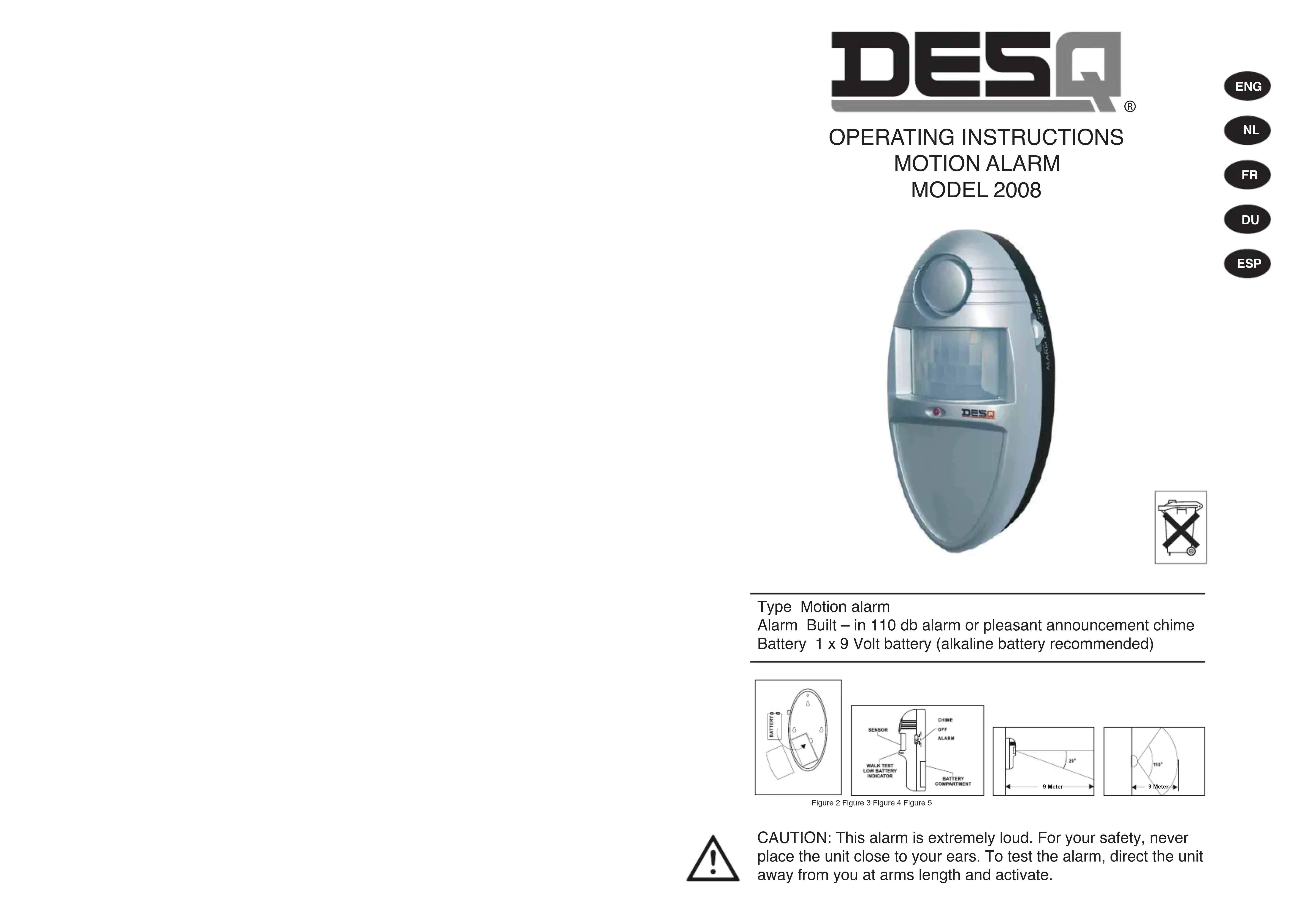 Het LED lampje aan de voorzijde van het systeem zal oplichten wanneer de batterij leeg gaat raken. Het lampje zal ingeschakeld blijven totdat de batterij wordt vervangen (9 Volt).FR INTRODUCTION Le détecteur de mouvements DESQ 2008 détectes l’intrusion de cambrioleurs dans votre bureau/à la maison. La technologie infrarouge, la plus nouvelle, est utilisée pour détecter chaque mouvement dans l’endroit à protéger. Ça peut donner une protection précieuse quand bien utilisé. Néanmoins, le système d’alarme ne peut pas donner une garantie de 100 % contre vol ou cambriolage. DESQ International ne peut pas être tenu responsable des dommages, directs ou indirects, qui peuvent être causés par suite de l’utilisation du système d’alarme. Gardez ces instructions pour usage futur. AVERTISSEMENT