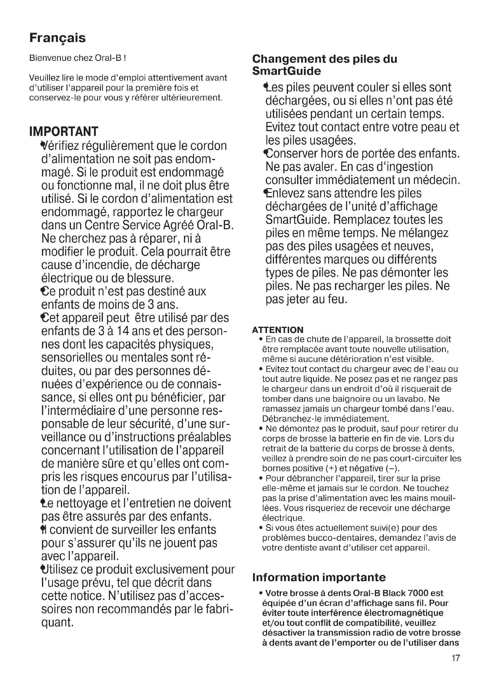 qui vous aideront à savoir à quel moment la brossette doit être remplacée. Dans le cadre d’un brossage minutieux, deux fois par jour pendant deux minutes, ces poils bleus perdront la moitié de leur coloration au bout de trois mois environ, vous indiquant alors qu’il est temps de remplacer la brossette. Si les poils s’écrasent avant que la couleur ne s’efface, cela indique que vous exercez une pression trop importante sur vos dents et vos gencives. Il est déconseillé d’utiliser les brossettes Oral-B FlossAction et Oral-B 3D White avec des appareils dentaires. Dans ce cas nous recommandons plutôt la brossette Oral-B Orthodontic (Kit Ortho Care Essentials) qui est spécifiquement conçue pour l’hygiène des dents appareillées. Synchronisation En cas d’utilisation, dans un même foyer, de plusieurs brosses à dents Oral-B Black 7000 dotées chacune d’une unité d’affichage SmartGuide spécifique, il est nécessaire d’éviter toute inter- férence de messages. Pour ce faire, vous devez assigner les corps de brosse à leur unité d’affi- chage respective. A cet effet, veuillez suivre les étapes ci-dessous : Vous pouvez synchroniser 2 corps de brosse maximum avec une unité d’affichage SmartGuide. Appuyez pendant au moins 3 secondes sur le bouton « h/min » situé dans le logement à piles. L’unité d’affichage SmartGuide affiche « L--- ». Vous devez mettre le corps de brosse en marche pour activer la synchronisation. Il est terminé lorsque vous voyez affiché « L-1- ». Arrêter le corps de brosse. Si vous souhaitez assigner un second corps de brosse à la même unité d’affichage SmartGuide, répétez les deux dernières opérations ci-dessus avec le deuxième corps de brosse, jusqu’à l’affichage de « L-2 ». Après avoir synchro- nisé le deuxième corps de brosse, l’unité d’affichage indiquera « Full » (Complet). Vous pouvez sortir du mode synchronisation en appuyant sur le bouton « h/min » ou sur le bouton « set ». Dans le cas con- traire, le mode synchronisation s’arrêtera automati- quement au bout de 30 secondes. Recommandations d’entretien Après le brossage, rincez la brossette à l’eau courante en la laissant en marche quelques secondes. Arrêtez la brosse, retirez la brossette du corps de brosse. Nettoyez les deux éléments séparément, essuyez-les avant de les réassembler. Séparer la base de rangement du chargeur. Le compartiment brossette et le couvercle passent au lave-vaisselle. Vous pouvez nettoyer le chargeur et le SmartGuide à l’aide d’un chiffon humide (schéma 5, page 5). Lorsque vous nettoyez l’étui de voyage (m), enlevez la partie intérieure. La partie intérieure passe au lave-vaisselle, l’extérieur doit être nettoyé avec un chiffon humide (schéma 5, page 5). Assurez-vous que toutes les parties sont sèches avant de réassembler l’étui de voyage. Note : Nettoyez les taches sur l’étui de voyage immédiatement. Rangez l’étui de voyage dans un endroit sec et propre. Support mural Si vous préférez installer l’unité d’affichage SmartGuide sur un mur, sur un miroir ou sur toute autre surface, servez-vous du ruban adhésif (l) pour fixer le support mural (k). Assurez-vous tout d’abord que la surface choisie est propre et sèche. Placez le ruban adhésif sur le côté et appuyez ensuite le support mural fermement contre le mur. Attendez 24h avant de glisser le support pour SmartGuide dans le support mural fixé au mur, placez le SmartGuide dans le support (schéma C, page 4). Le ruban adhésif ne tiendra pas sur des surfaces anti-taches. Sujet à modification sans préavis. Ce produit est conforme aux normes européennes fixées par les Directives Européennes 1999/5/CE. Récepteur Classe 3, Cycle de travail Classe 3. Vous pouvez trouver la déclaration complète de conformité CE sur notre site www.oralb.com/ce 92036479_D34_WE_7000_S6-68.indd 21 19.12.12 13:49 CSS APPROVED Effective Date 27Dec2012 GMT - Printed 05Mar2013 Page 20 of 6722 Respect de l’environnement Cet appareil contient des batteries rechar- geables. Pour la protection de l’environne- ment, une fois l’appareil en fin de vie, ne le jetez pas avec les déchets ménagers. Veuillez le déposer dans un Centre Service Agréé Oral-B Braun ou dans des lieux de collecte adaptés mis à votre disposition dans votre localité. Garantie Cet appareil bénéficie d’une garantie de 2 ans à compter de la date d’achat. Pendant la durée de la garantie, nous prendrons gratuitement à notre charge la réparation des vices de fabrication ou de matière en se réservant le droit de décider si certaines pièces doivent être réparées ou si l’appa- reil lui-même doit être échangé. Cette garantie couvre tous les pays dans lesquels cet appareil est commercialisé par Braun ou son distributeur agréé. Cette garantie ne couvre pas : les dommages occasionnés par une utilisation inadéquate et l’usure normale, particulièrement pour les bros- settes, ainsi que les défauts ayant un impact négligeable sur la valeur ou le fonctionnement de l’appareil. Cette garantie devient caduque si des réparations ont été effectuées par des personnes non agréées par Braun ou si des pièces de rechange ne provenant pas de Braun ont été utilisées. Pour bénéficier des prestations pendant la période de garantie, retournez ou rapportez l’appareil complet avec votre preuve d’achat à un Centre service agréé Oral-B Braun. Garantie et brossettes de remplacement La garantie Oral-B ne sera pas appliquée si les dommages du corps de brosse à dents électrique rechargeable se trouvent être attribués à l’utilisation de brossettes autres que Oral-B. Oral-B ne recommande pas l’utilisation de bros- settes autres que Oral-B.