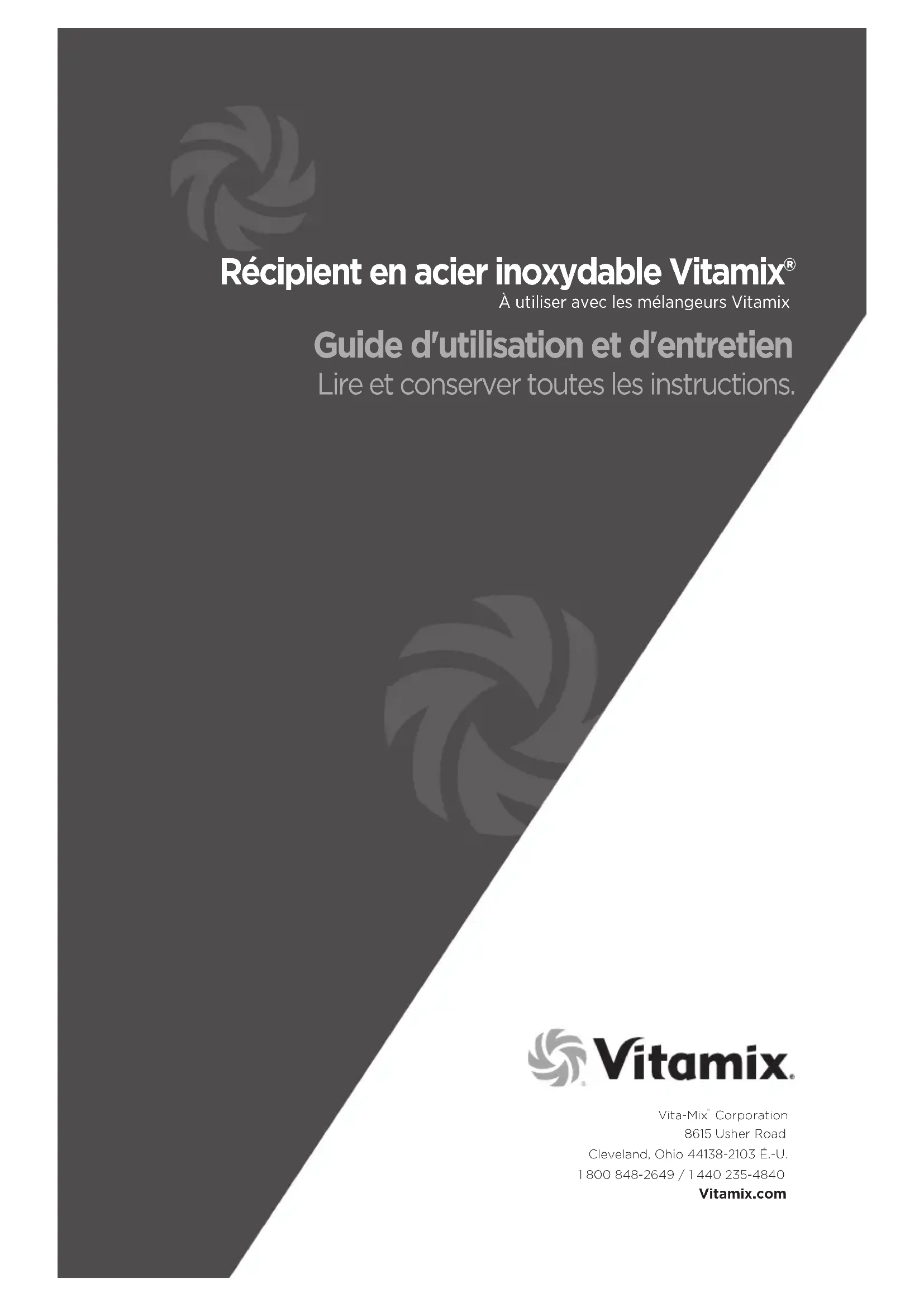 mélangeur et des récipients Vitamix®, prière d'adopter des mesures de sécurité essentielles, notamment les suivantes . LIRE LES INSTRUCTIONS, LES MESURES DE SÉCURITÉ ET LES MISES EN GARDE EN ENTIER AVANT D'UTILISER LE MÉLANGEUR. 1. Lisez toutes les instructions.2. Ne pas utiliser le récipient à d'autres fins auxquelles il est prévu.3. Ne JAMAIS toucher des pièces en mouvement.