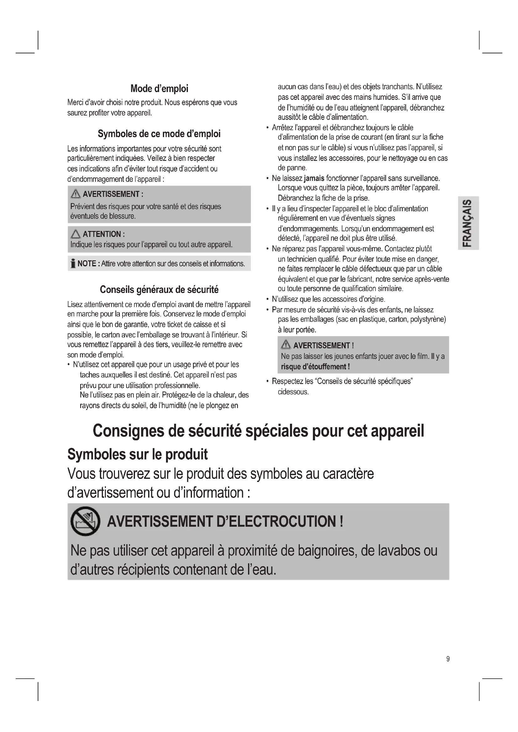 - N’utilisez cet appareil que pour un usage privé et pour les taches auxquelles il est destiné. Cet appareil n’est pas prévu pour une utilisation professionnelle. Ne l’utilisez pas en plein air. Protégez-le de la chaleur, des rayons directs du soleil, de l’humidité (ne le plongez en Consignes de sécurité spéciales pour cet appareil Symboles sur le produit Vous trouverez sur le produit des symboles au caractère d’avertissement ou d’information : AVERTISSEMENT D’ELECTROCUTION ! Ne pas utiliser cet appareil à proximité de baignoires, de lavabos ou d’autres récipients contenant de l’eau.10