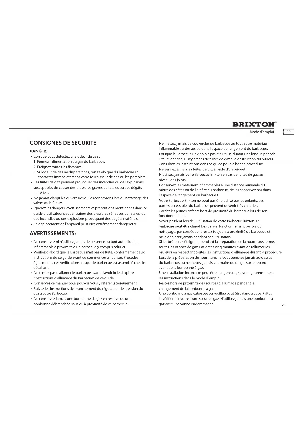- N'utilisez jamais votre Barbecue Brixton en cas de fuites de gaz au niveau des joints.
