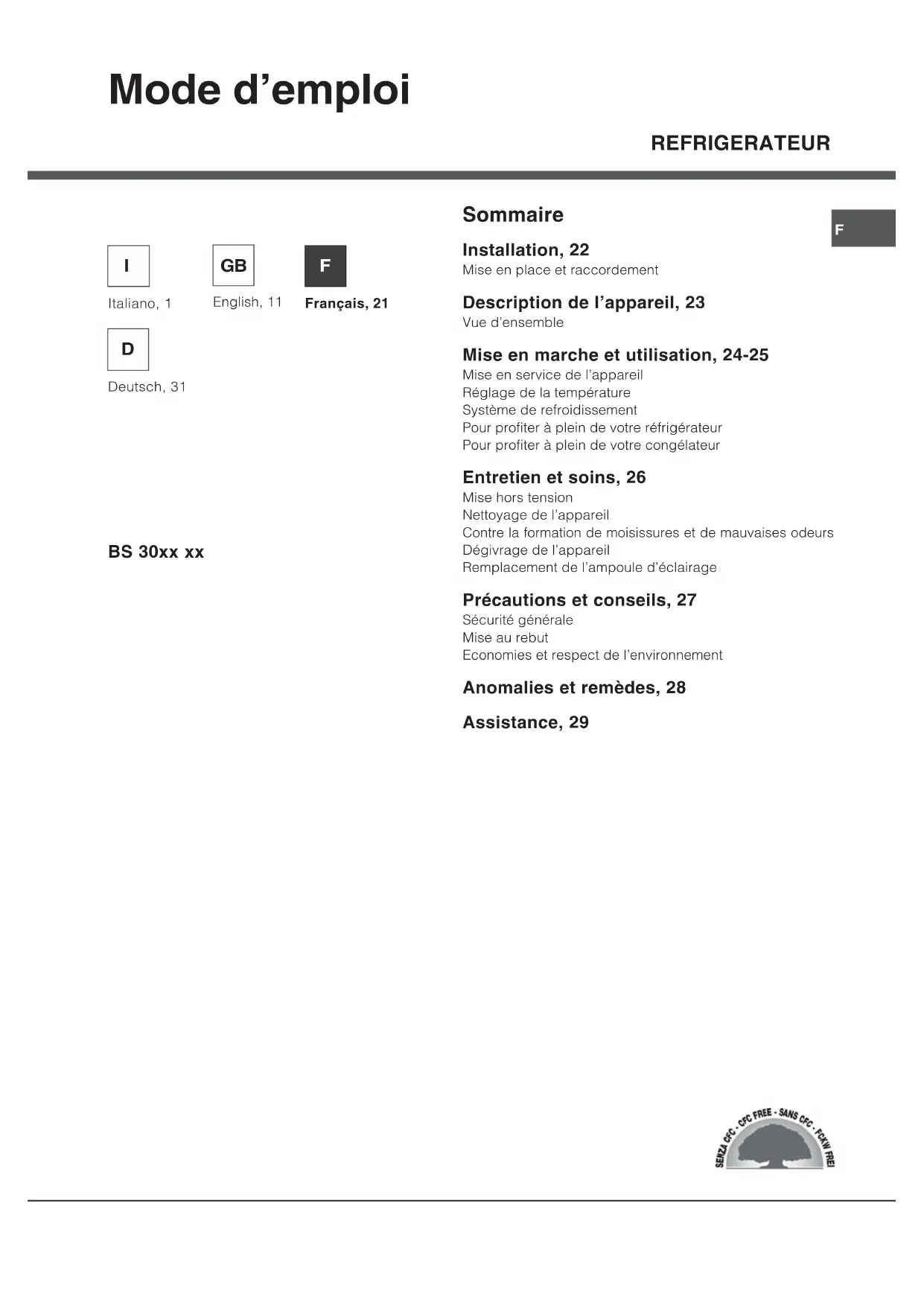 11/2011 - Xerox Business ServicesREFRIGERATEUR Mode d’emploi Sommaire Installation, 22 Mise en place et raccordement Description de l’appareil, 23 Vue d’ensemble Mise en marche et utilisation, 24-25 Mise en service de l’appareil Réglage de la température Système de refroidissement Pour profiter à plein de votre réfrigérateur Pour profiter à plein de votre congélateur Entretien et soins, 26 Mise hors tension Nettoyage de l’appareil Contre la formation de moisissures et de mauvaises odeurs Dégivrage de l’appareil Remplacement de l’ampoule d’éclairage Précautions et conseils, 27 Sécurité générale Mise au rebut Economies et respect de l’environnement Anomalies et remèdes, 28 Assistance, 29