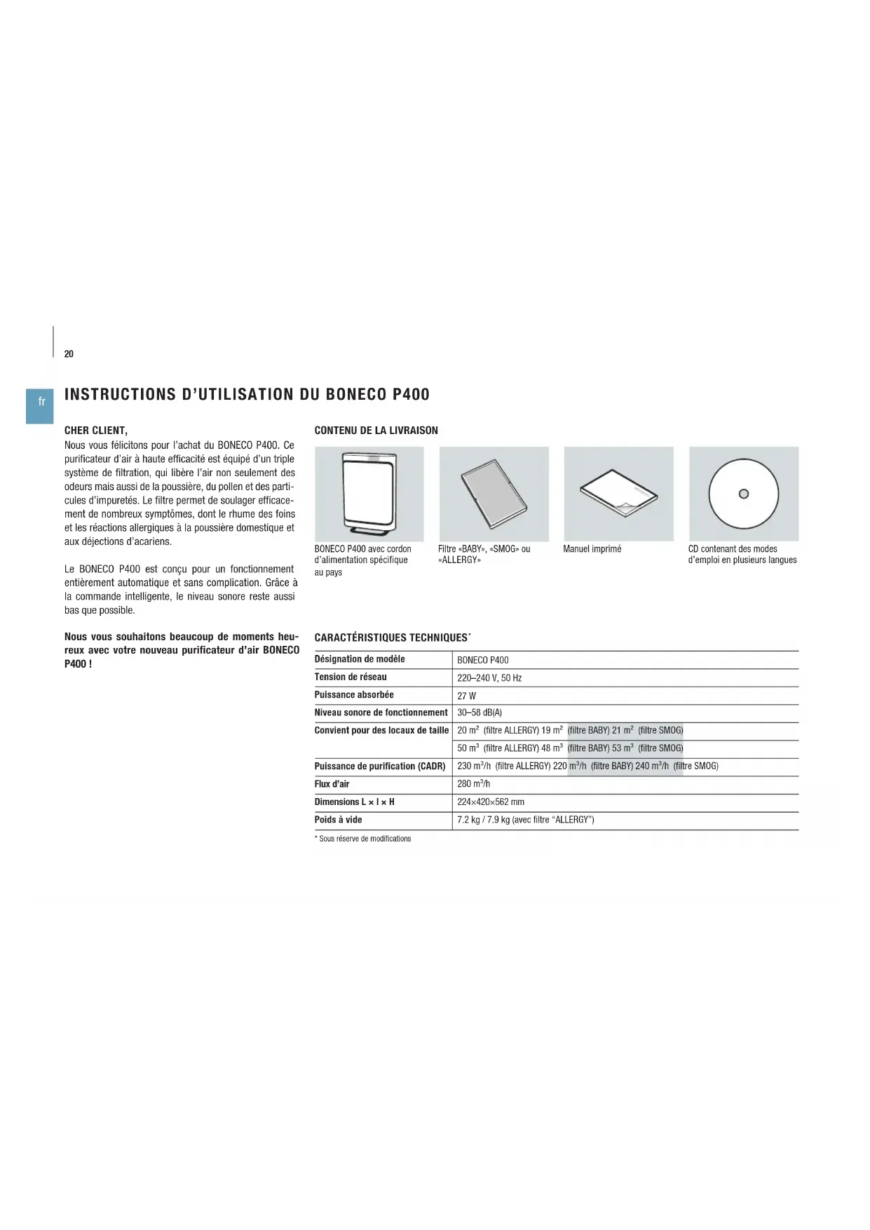 - Sous réserve de modifications Manuel imprimé Désignation de modèle BONECO P400 Tension de réseau 220–240 V, 50 Hz Puissance absorbée 27 W Niveau sonore de fonctionnement 30–58 dB(A) Convient pour des locaux de taille 20 m² (filtre ALLERGY) 19 m² (filtre BABY) 21 m² (filtre SMOG) 50 m³ (filtre ALLERGY) 48 m³ (filtre BABY) 53 m³ (filtre SMOG) Puissance de purification (CADR) 230 m³/h (filtre ALLERGY) 220 m³/h (filtre BABY) 240 m³/h (filtre SMOG) Flux d’air 280 m³/h Dimensions L × l × H 224×420×562 mm Poids à vide