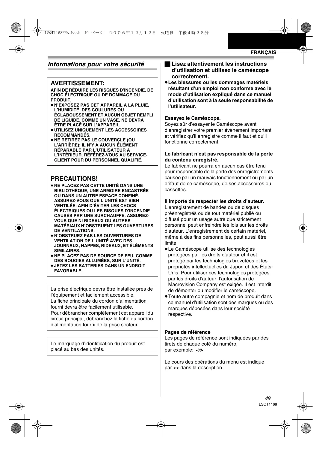 ª Lisez attentivement les instructions d’utilisation et utilisez le caméscope correctement. ≥Les blessures ou les dommages matériels résultant d’un emploi non conforme avec le mode d’utilisation expliqué dans ce manuel d’utilisation sont à la seule responsabilité de l’utilisateur. Essayez le Caméscope. Soyez sûr d’essayer le Caméscope avant d’enregistrer votre premier évènement important et vérifiez qu’il enregistre comme il faut et qu’il fonctionne correctement. Le fabricant n’est pas responsable de la perte du contenu enregistré. Le fabricant ne pourra en aucun cas être tenu pour responsable de la perte des enregistrements causée par un mauvais fonctionnement ou par un défaut de ce caméscope, de ses accessoires ou cassettes. Il importe de respecter les droits d’auteur. L’enregistrement de bandes ou de disques préenregistrés ou de tout matériel publié ou diffusé pour un usage autre que strictement personnel peut enfreindre les lois sur les droits d’auteur. L’enregistrement de certain matériel, même à des fins personnelles, peut aussi être limité. ≥Le Caméscope utilise des technologies protégées par les droits d’auteur et il est protégé par les technologies brevetées et les propriétés intellectuelles du Japon et des ÉtatsUnis. Pour utiliser ces technologies protégées par les droits d’auteur, l’autorisation de Macrovision Company est exigée. Il est interdit de démonter ou modifier le caméscope. ≥Toute autre compagnie et nom de produit dans ce manuel d’utilisation sont des marques ou des marques déposées dans leur société respective.