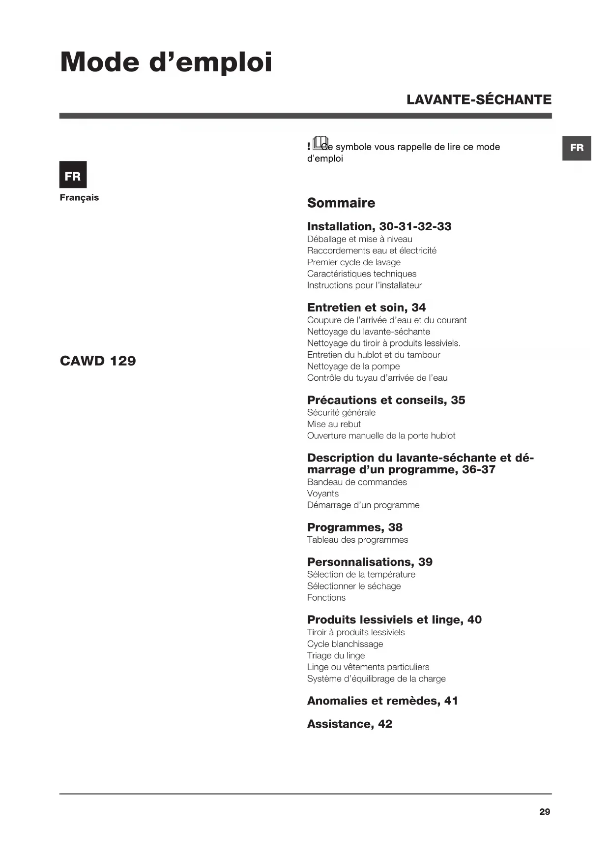 Français ! Ce symbole vous rappelle de lire ce mode d’emploi Sommaire Installation, 30-31-32-33 Déballage et mise à niveauRaccordements eau et électricitéPremier cycle de lavageCaractéristiques techniquesInstructions pour l’installateur Entretien et soin, 34 Coupure de l’arrivée d’eau et du courantNettoyage du lavante-séchanteNettoyage du tiroir à produits lessiviels.Entretien du hublot et du tambourNettoyage de la pompeContrôle du tuyau d’arrivée de l’eau Précautions et conseils, 35 Sécurité généraleMise au rebutOuverture manuelle de la porte hublot Description du lavante-séchante et dé- marrage d’un programme, 36-37 Bandeau de commandesVoyantsDémarrage d’un programme Programmes, 38 Tableau des programmes Personnalisations, 39 Sélection de la températureSélectionner le séchageFonctions Produits lessiviels et linge, 40 Tiroir à produits lessivielsCycle blanchissageTriage du lingeLinge ou vêtements particuliersSystème d’équilibrage de la charge Anomalies et remèdes, 41 Assistance, 42