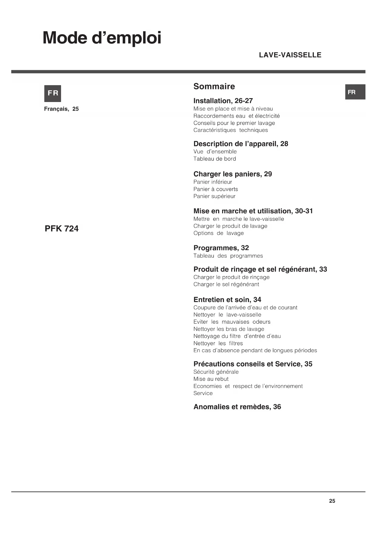 Mode demploi Sommaire Installation, 26-27 Mise en place et mise à niveau Raccordements eau et électricité Conseils pour le premier lavage Caractéristiques techniques Description de lappareil, 28 Vue densemble Tableau de bord Charger les paniers, 29 Panier inférieur Panier à couverts Panier supérieur Mise en marche et utilisation, 30-31 Mettre en marche le lave-vaisselle Charger le produit de lavage Options de lavage Programmes, 32 Tableau des programmes Produit de rinçage et sel régénérant, 33 Charger le produit de rinçage Charger le sel régénérant Entretien et soin, 34 Coupure de larrivée deau et de courant Nettoyer le lave-vaisselle Eviter les mauvaises odeurs Nettoyer les bras de lavage Nettoyage du filtre dentrée deau Nettoyer les filtres En cas dabsence pendant de longues périodes Précautions conseils et Service, 35 Sécurité générale Mise au rebut Economies et respect de lenvironnement Service Anomalies et remèdes, 36 Français, 25